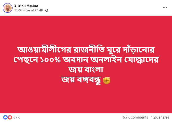 ২০২৪ সালের আগস্টে গণঅভ্যুত্থানের মুখে ক্ষমতাচ্যুত হয়ে ভারতে আশ্রয় নেন বাংলাদেশের সাবেক প্রধানমন্ত্রী ও আওয়ামী লীগের সভাপতি শেখ হাসিনা। বর্তমানে তিনি ভারতেই অবস্থান করছেন বলে জানা গেছে। এর মধ্যে গত ১৪ অক্টোবরে “আওয়ামীলীগের রাজনীতি ঘুরে দাঁড়ানোর পেছনে ১০০% অবদান অনলাইন যোদ্ধাদের” শিরোনামে শেখ হাসিনার মন্তব্য দাবিতে একটি পোস্ট ফেসবুকে প্রচার করা হয়েছে।