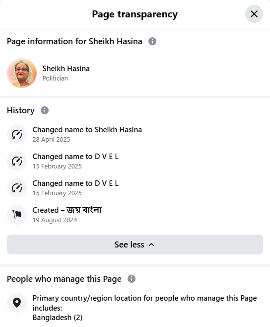 পরবর্তী অনুসন্ধানে, আলোচিত ফেসবুক পেজটির ট্রান্সপারেন্সি সেকশন পর্যবেক্ষণে দেখা গেছে, পেজটি বাংলাদেশ থেকে পরিচালিত হচ্ছে। ২০২৪ সালের ১৯ আগস্ট ‘জয় বাংলা’ নামে এটি খোলা হয়। এরপর একাধিকবার পেজের নাম পরিবর্তন করে সর্বশেষ চলতি বছরের ২৮ এপ্রিলে ‘Sheikh Hasina’ নাম দেয়া হয়।
