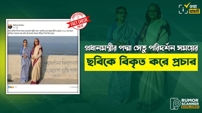 অর্থাৎ, প্রধানমন্ত্রী শেখ হাসিনার পদ্মা সেতুর নির্মাণ কাজের অগ্রগতি পরিদর্শনকালে তোলা একটি ছবিকে বিকৃত করে ভিন্ন দাবিতে সামাজিক মাধ্যমে প্রচার করা হচ্ছে; যা সম্পূর্ণ ভুয়া।