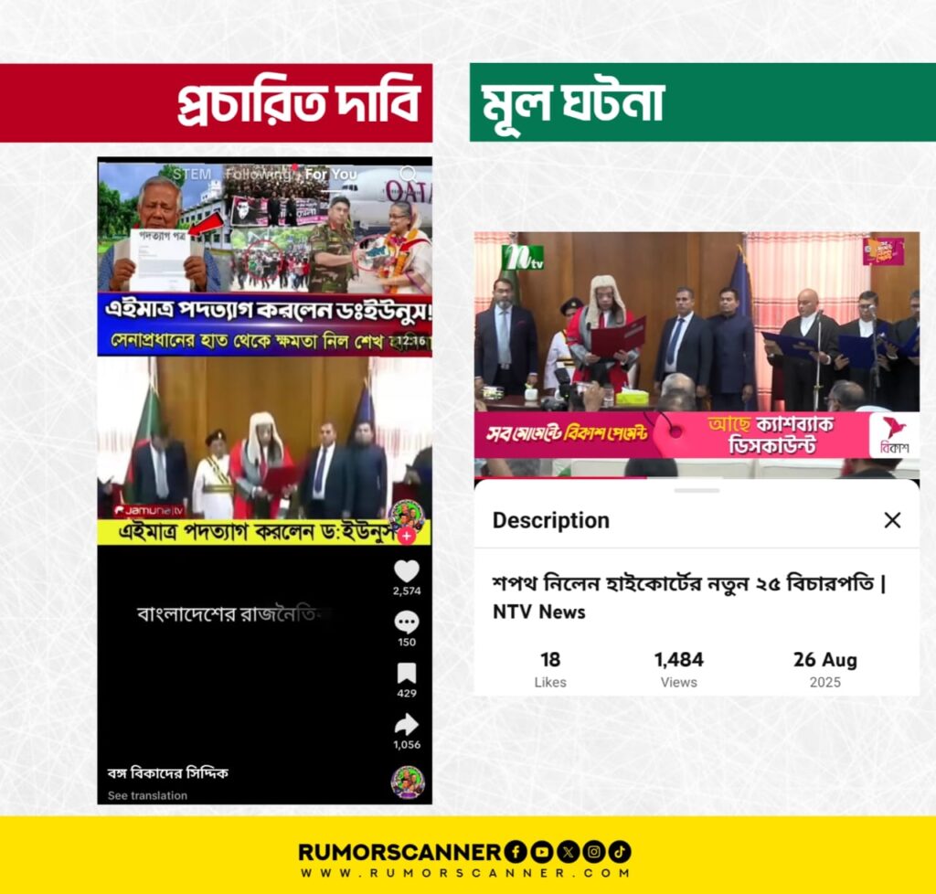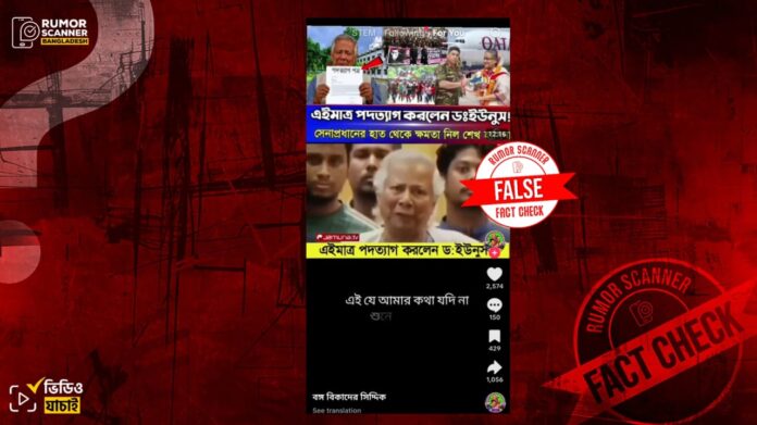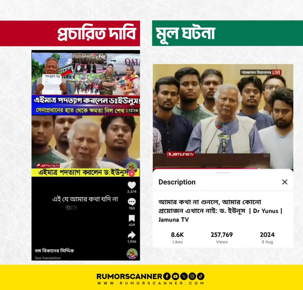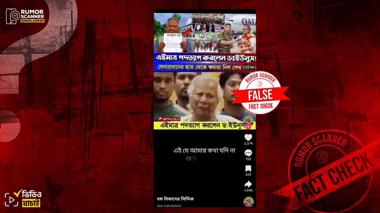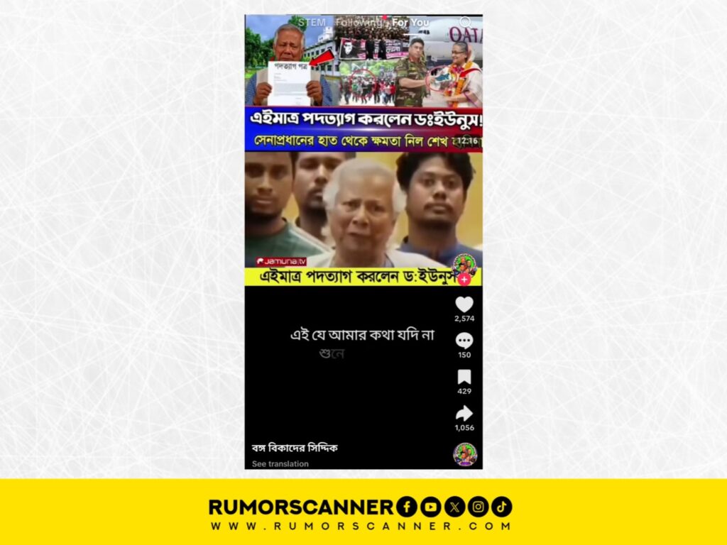সম্প্রতি, “এইমাত্র পদত্যাগ করলেন ডঃইউনুস! সেনাপ্রধানের হাত থেকে ক্ষমতা নিল শেখ হাসিনা” শীর্ষক ক্যাপশনে একটি ভিডিও সামাজিক যোগাযোগ মাধ্যমে প্রচার করা হয়েছে।