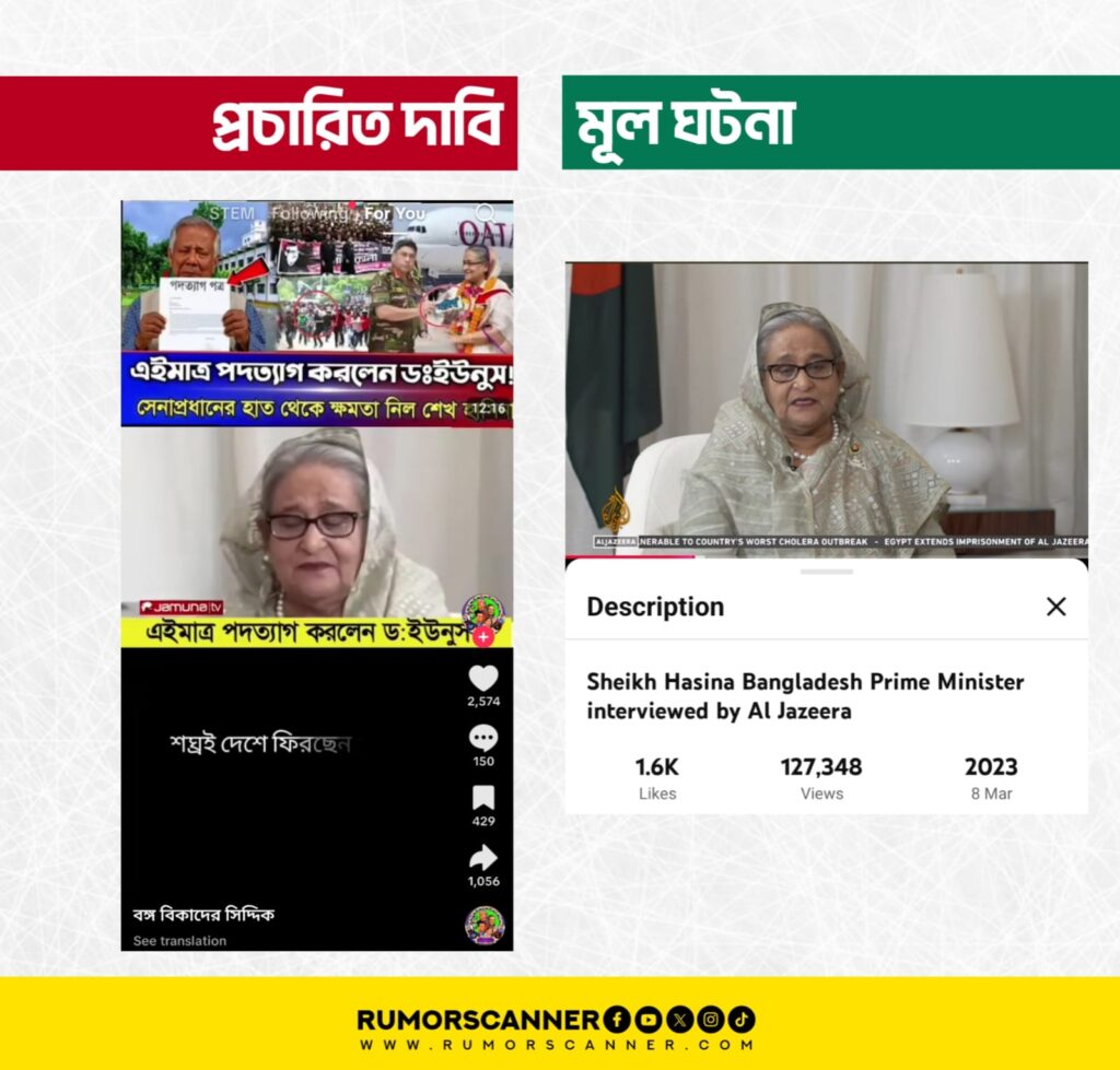 এ বিষয়ে অনুসন্ধানে আন্তর্জাতিক গণমাধ্যম আল জাজিরার ইউটিউব চ্যানেলে ২০২৩ সালের ৮ মার্চ ‘Sheikh Hasina Bangladesh Prime Minister interviewed by Al Jazeera’ শিরোনামে প্রচারিত একটি ভিডিও খুঁজে পাওয়া যায়। উক্ত ভিডিওর সাথে আলোচিত দাবিতে প্রচারিত ভিডিওর মিল রয়েছে।