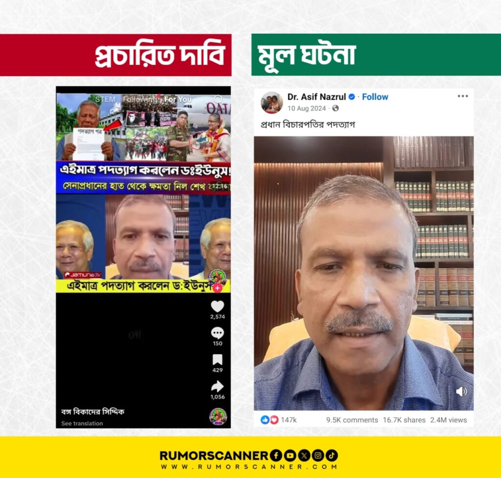 ভিডিওটিতে সাবেক প্রধান বিচারপতি ওবায়দুল হাসানের পদত্যাগের কথা জানিয়েছিলেন অন্তর্বর্তীকালীন সরকারের আইন, বিচার ও সংসদবিষয়ক উপদেষ্টা অধ্যাপক আসিফ নজরুল।