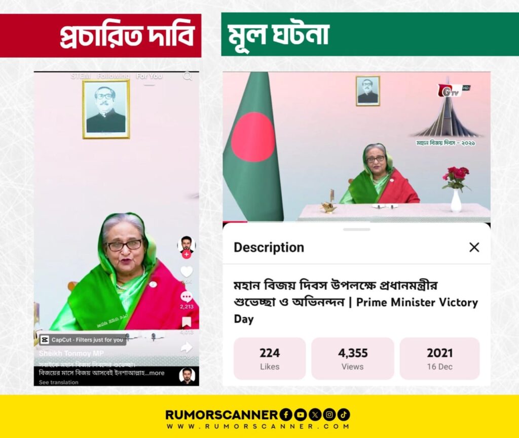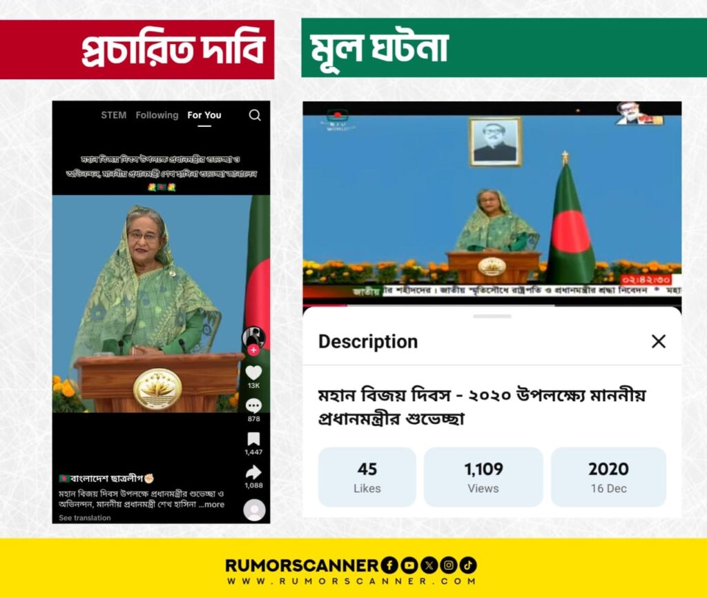 এ বিষয়ে অনুসন্ধানে বাংলাদেশ টেলিভিশনের ইউটিউব চ্যানেলে ২০২০ সালের ১৬ ডিসেম্বর ‘মহান বিজয় দিবস – ২০২০ উপলক্ষ্যে মাননীয় প্রধানমন্ত্রীর শুভেচ্ছা’ শিরোনামে প্রচারিত একটি ভিডিও খুঁজে পাওয়া যায়। উক্ত ভিডিওর সাথে আলোচিত দাবিতে প্রচারিত ভিডিওর মিল রয়েছে।