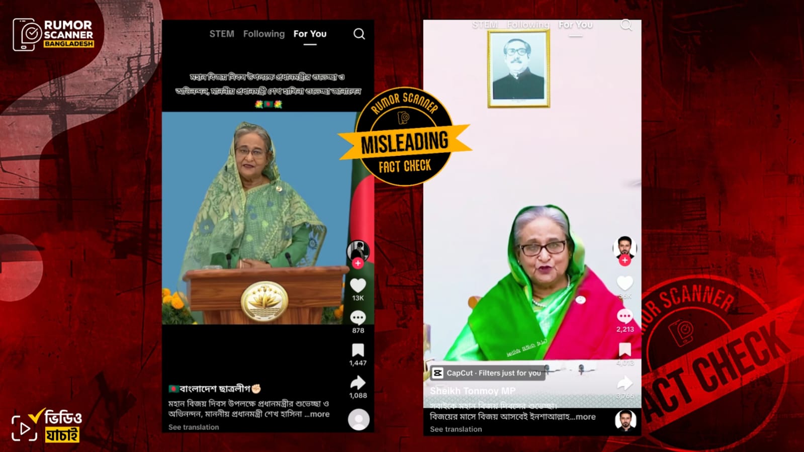 রিউমর স্ক্যানার টিমের অনুসন্ধানে জানা যায়, প্রচারিত ভিডিওগুলো সাম্প্রতিক সময়ের নয়। প্রকৃতপক্ষে, ২০২০ ও ২০২১ সালে প্রধানমন্ত্রী হিসেবে শেখ হাসিনার দেওয়া বিজয় দিবসের শুভেচ্ছা বার্তার পুরোনো দুইটি ভিডিওকে সাম্প্রতিক দাবিতে প্রচার করা হয়েছে।
