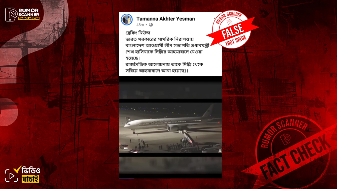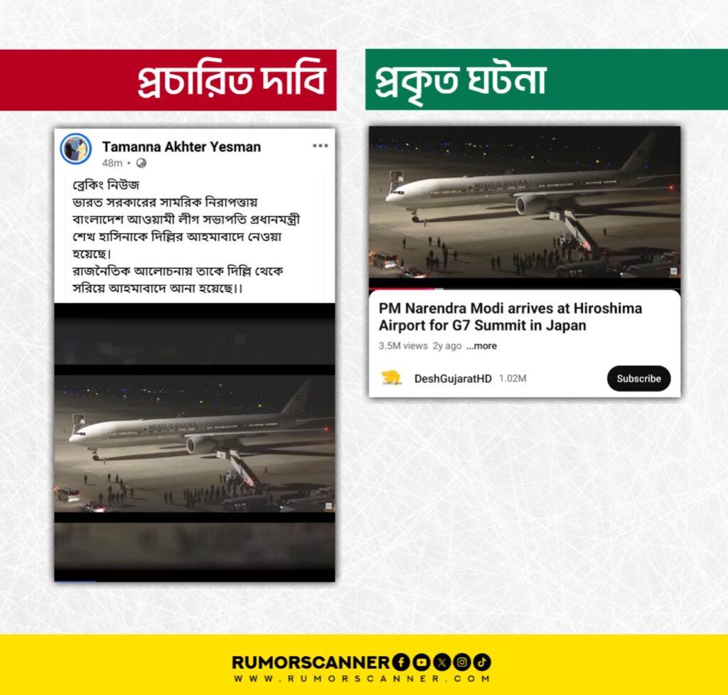 রিউমর স্ক্যানার টিমের অনুসন্ধানে জানা যায়, প্রচারিত ভিডিওটি শেখ হাসিনাকে বহনকারী কোনো বিমানের নয়। প্রকৃতপক্ষে, ২০২৩ সালে জি ৭ সম্মেলনে যোগ দিতে ভারতের প্রধানমন্ত্রী নরেন্দ্র মোদির জাপানে পৌঁছানোর ভিডিওকে আলোচিত দাবিতে প্রচার করা হয়েছে।