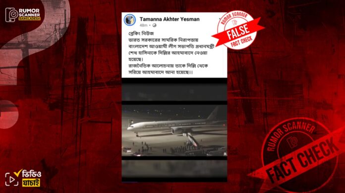সম্প্রতি ‘ব্রেকিং নিউজ ভারত সরকারের সামরিক নিরাপত্তায় বাংলাদেশ আওয়ামী লীগ সভাপতি প্রধানমন্ত্রী শেখ হাসিনাকে দিল্লির আহমাবাদে নেওয়া হয়েছে। রাজনৈতিক আলোচনায় তাকে দিল্লি থেকে সরিয়ে আহমাবাদে আনা হয়েছে।।’ ক্যাপশনে একটি ভিডিও সামাজিক যোগাযোগ মাধ্যমে প্রচার করা হয়েছে।
