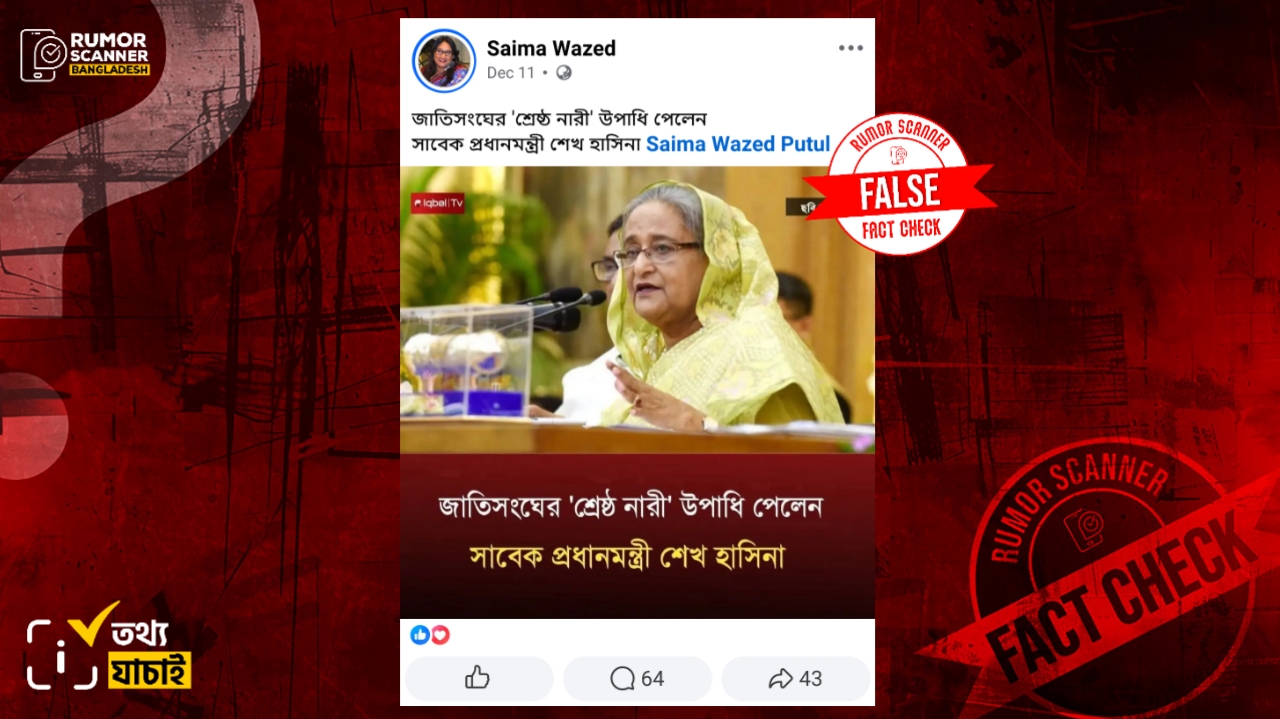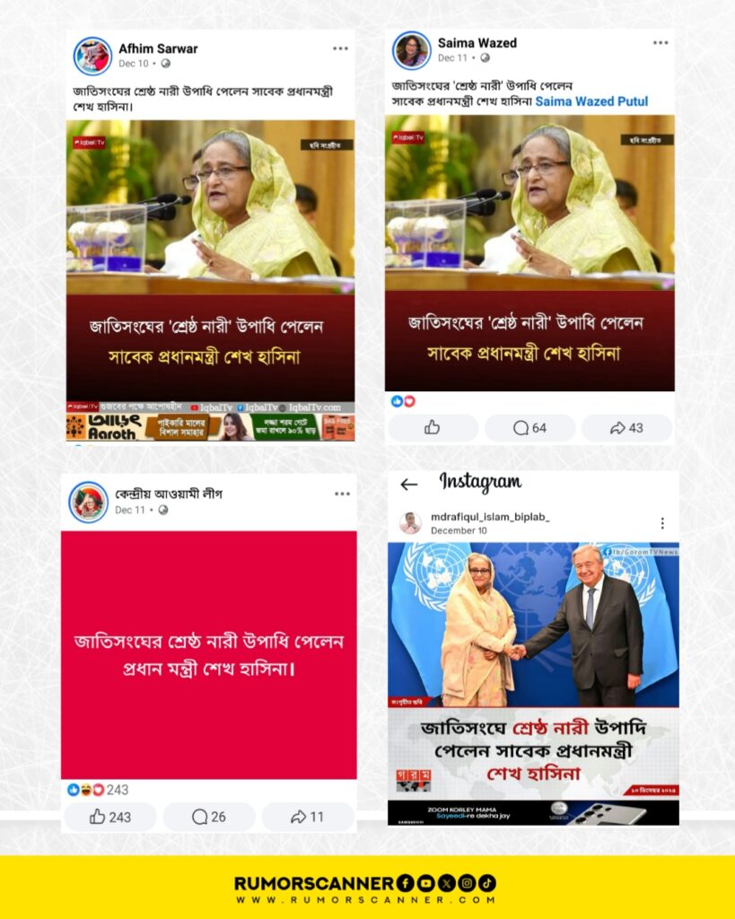 সম্প্রতি, সামাজিক যোগাযোগ মাধ্যমে একটি ফটোকার্ড প্রচার করে দাবি করা হয় জাতিসংঘের ‘শ্রেষ্ঠ নারী’ উপাধি পেয়েছেন আদালতে দণ্ডপ্রাপ্ত ক্ষমতাচ্যুত সাবেক প্রধানমন্ত্রী শেখ হাসিনা। ফটোকার্ডটি সামাজিক যোগাযোগ মাধ্যমের একাধিক প্ল্যাটফর্মে শেয়ার করা হয়।