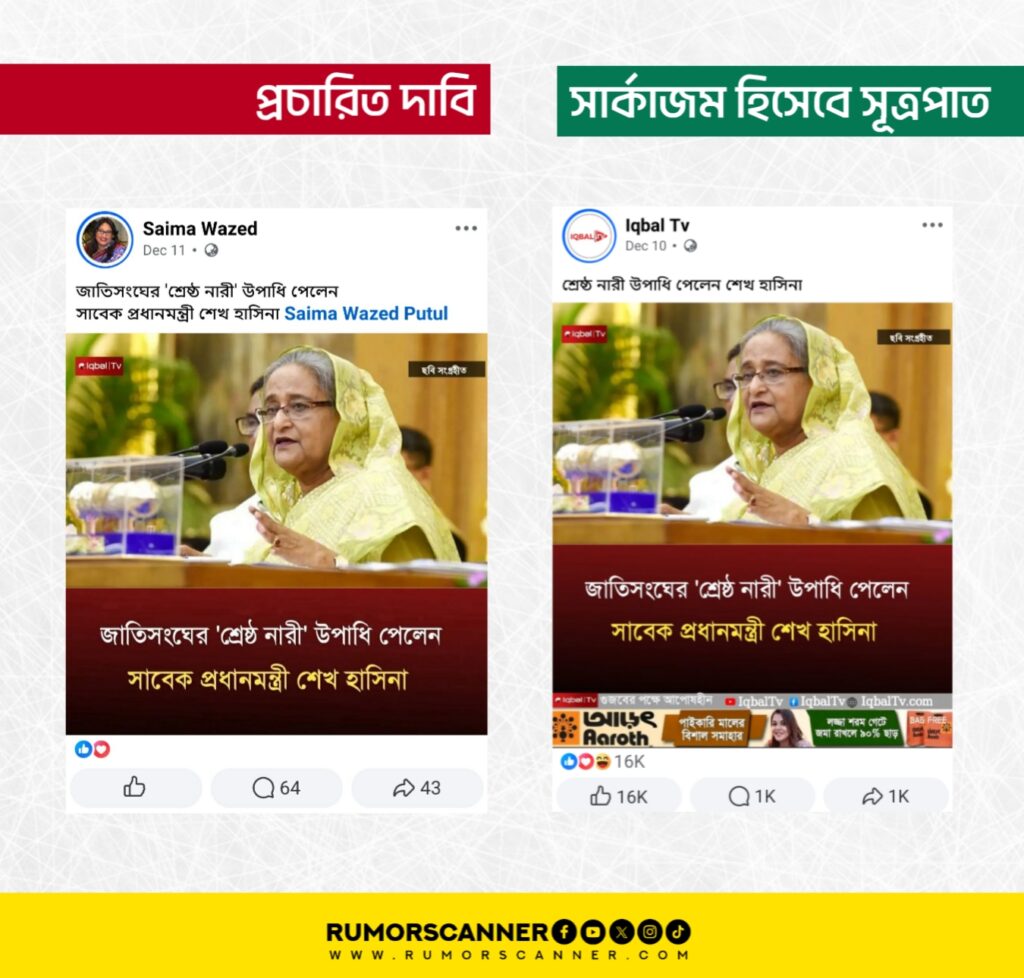 রিউমর স্ক্যানার টিমের অনুসন্ধানে জানা যায়, শেখ হাসিনা জাতিসংঘের শ্রেষ্ঠ নারী উপাধি পাননি। প্রকৃতপক্ষে, একটি স্যাটায়ার পেজের ব্যঙ্গাত্মক পোস্ট থেকে সূত্রপাত হওয়া পোস্টকে আসল খবর দাবিতে প্রচার করা হয়েছে।