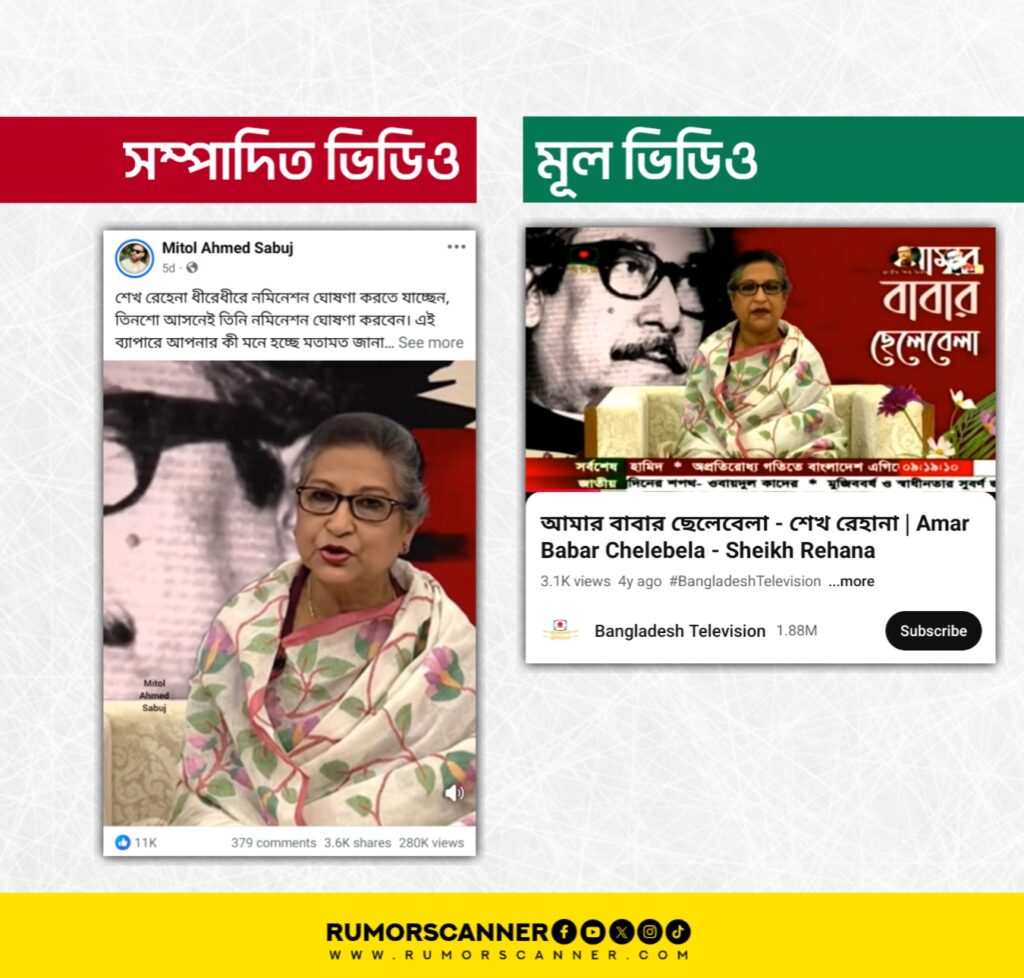 এ বিষয়ে অনুসন্ধানে বাংলাদেশ টেলিভিশন এর ইউটিউব চ্যানেলে ২০২১ সালের ১৭ মার্চ ‘আমার বাবার ছেলেবেলা শেখ রেহানা’ শিরোনামে প্রকাশিত একটি ভিডিও খুঁজে পাওয়া যায়। উক্ত ভিডিওর সাথে আলোচিত দাবিতে প্রচারিত ভিডিওটির আংশিক সাদৃশ্য রয়েছে।