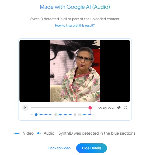 পরবর্তীতে, প্রচারিত ভিডিওটির অডিও অংশটি এআই প্রযুক্তির সহায়তায় তৈরি কি না তা যাচাই করতে রিউমর স্ক্যানার টিম গুগলের বিশেষ শনাক্তকরণ প্রযুক্তি ‘SynthID’ ব্যবহার করে। গুগলের এই প্রযুক্তি এআই দিয়ে তৈরি ছবি, ভিডিও বা অডিওতে অদৃশ্য জলছাপ যুক্ত করে, যা খালি চোখে দেখা না গেলেও গুগলের নিজস্ব টুলের মাধ্যমে শনাক্ত করা যায়। বুম বাংলাদেশের সহায়তায় ভিডিওটি সিন্থআইডি দিয়ে বিশ্লেষণ করে দেখা যায়, এটির অডিও ক্লিপটি গুগলের এআই প্রযুক্তির সহায়তায় তৈরি।