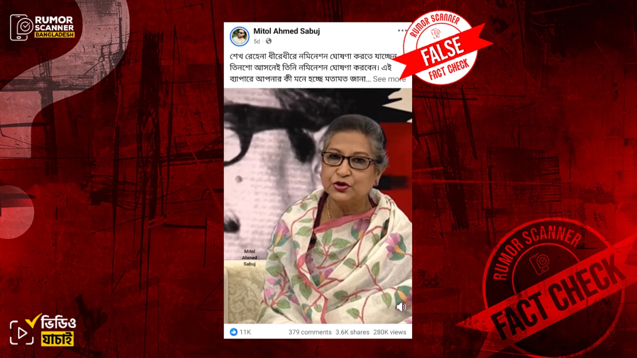 রিউমর স্ক্যানার টিমের অনুসন্ধানে জানা যায়, শেখ রেহানা আসন্ন সংসদ নির্বাচনে বিভিন্ন আসনে বাংলাদেশ আওয়ামী লীগের মনোনীত প্রার্থী ঘোষণা করেননি। প্রকৃতপক্ষে, ডিপফেক প্রযুক্তি ব্যবহার করে এই ভুয়া ভিডিওটি তৈরি করা হয়েছে।