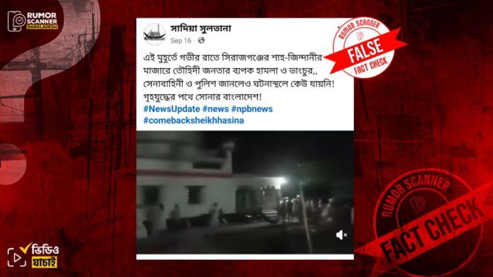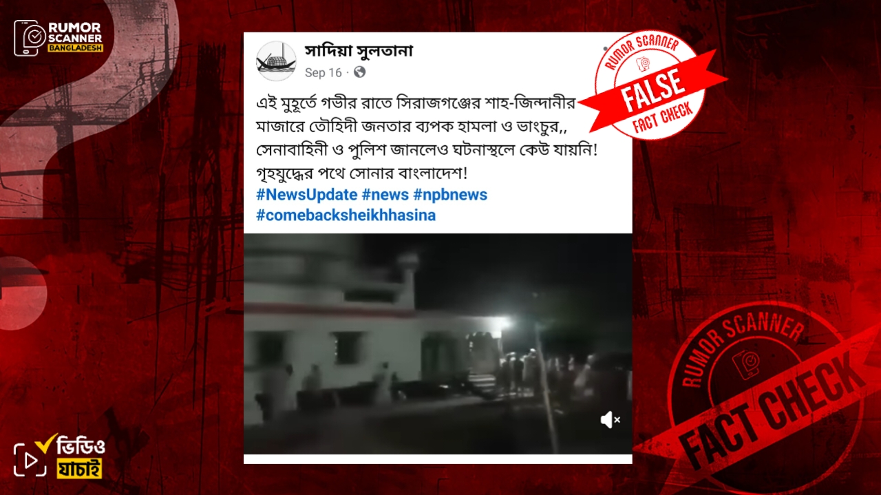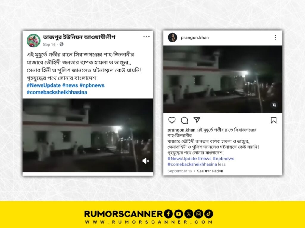 গত ১৬ সেপ্টেম্বর থেকে ‘এই মুহূর্তে গভীর রাতে সিরাজগঞ্জের শাহ-জিন্দানীর মাজারে তৌহিদী জনতার ব্যপক হামলা ও ভাংচুর,, সেনাবাহিনী ও পুলিশ জানলেও ঘটনাস্থলে কেউ যায়নি!…’ ক্যাপশনে একটি ভিডিও ইন্টারনেটের বিভিন্ন প্লাটফর্মে প্রচার করা হয়েছে৷