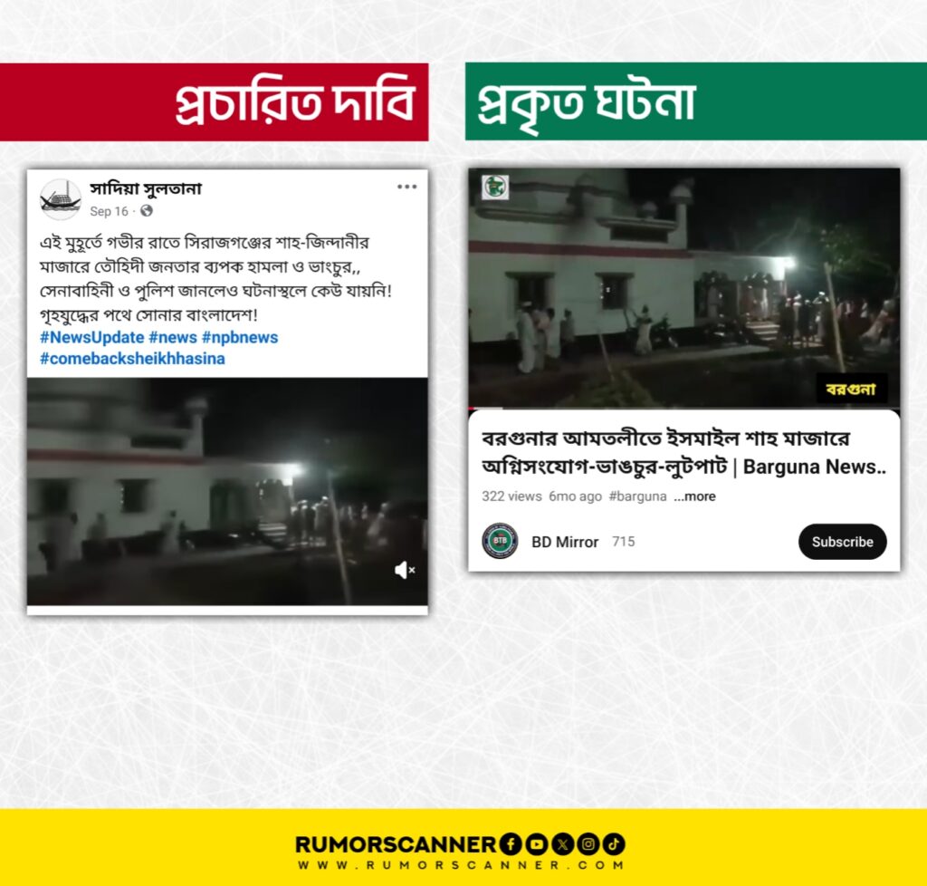 রিউমর স্ক্যানার টিমের অনুসন্ধানে জানা যায়, প্রচারিত ভিডিওটি সিরাজগঞ্জের শাহ শরীফ জিন্দানী (রাঃ) মাজারের নয়। প্রকৃতপক্ষে, গত মার্চে বরগুনার ভিন্ন একটি মাজার ভাঙচুর-অগ্নিসংযোগের ঘটনার ভিডিওকে উক্ত দাবিতে প্রচার করা হয়েছে।