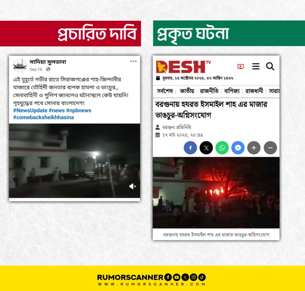 পরবর্তীতে, ইলেকট্রনিক গণমাধ্যম দেশ টিভির ওয়েবসাইটে গত ১৭ মার্চ ‘বরগুনায় হযরত ইসমাইল শাহ এর মাজার ভাঙচুর-অগ্নিসংযোগ’ শিরোনামে প্রকাশিত একটি প্রতিবেদন খুঁজে পাওয়া যায়। উক্ত প্রতিবেদনে যুক্ত ছবিটির সাথে আলোচিত ভিডিওর দৃশ্যের মিল রয়েছে।