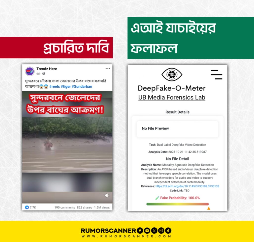 রিউমর স্ক্যানার টিমের অনুসন্ধানে জানা যায়, সুন্দরবনে জেলে নৌকায় বাঘের আক্রমণ দাবিতে প্রচারিত ভিডিওটি আসল নয়। প্রকৃতপক্ষে, কৃত্রিম বুদ্ধিমত্তার (এআই) সহায়তায় তৈরি একটি ভিডিওকে আসল ভিডিও দাবিতে প্রচার করা হয়েছে৷