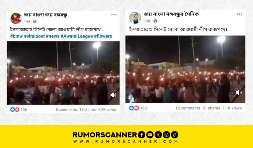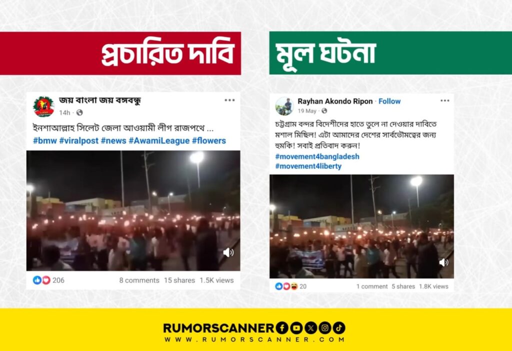 রিউমর স্ক্যানার টিমের অনুসন্ধানে জানা যায়, এটি সাম্প্রতিক সময়ে সিলেটে আওয়ামী লীগের মিছিলের ভিডিও নয়। প্রকৃতপক্ষে, গত ১৯ মে চট্টগ্রাম বন্দরের টার্মিনালে বিদেশি অপারেটর নিয়োগ উদ্যোগের প্রতিবাদে শ্রমিক দলের মশাল মিছিলের ভিডিও।