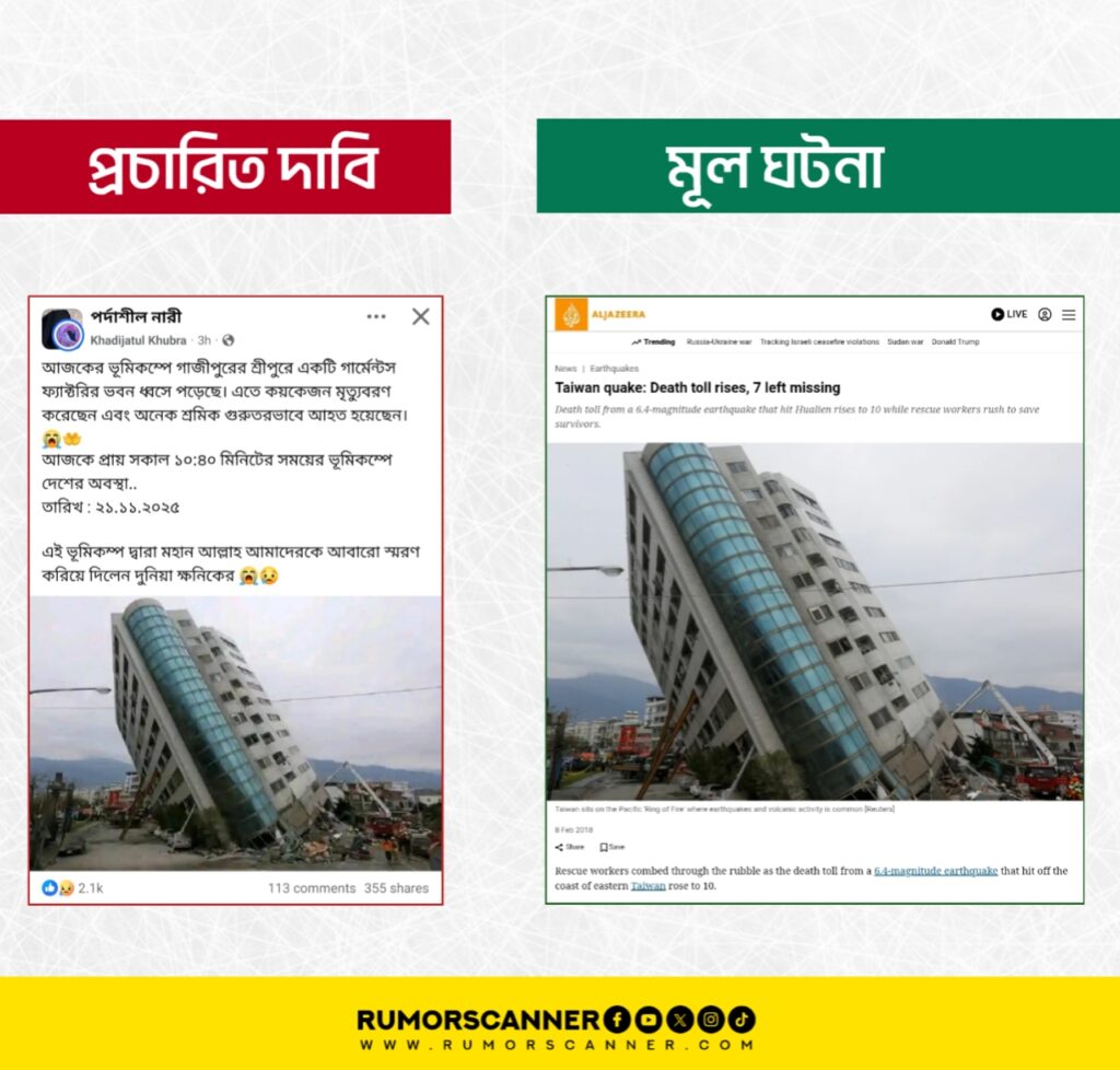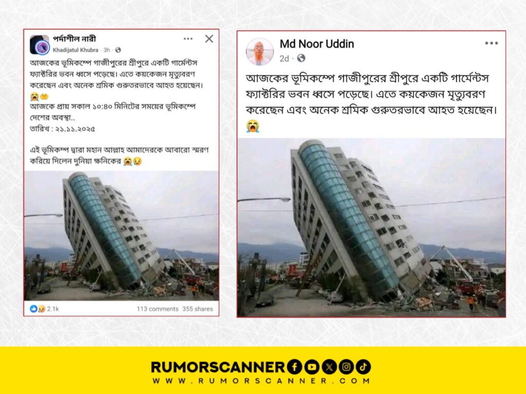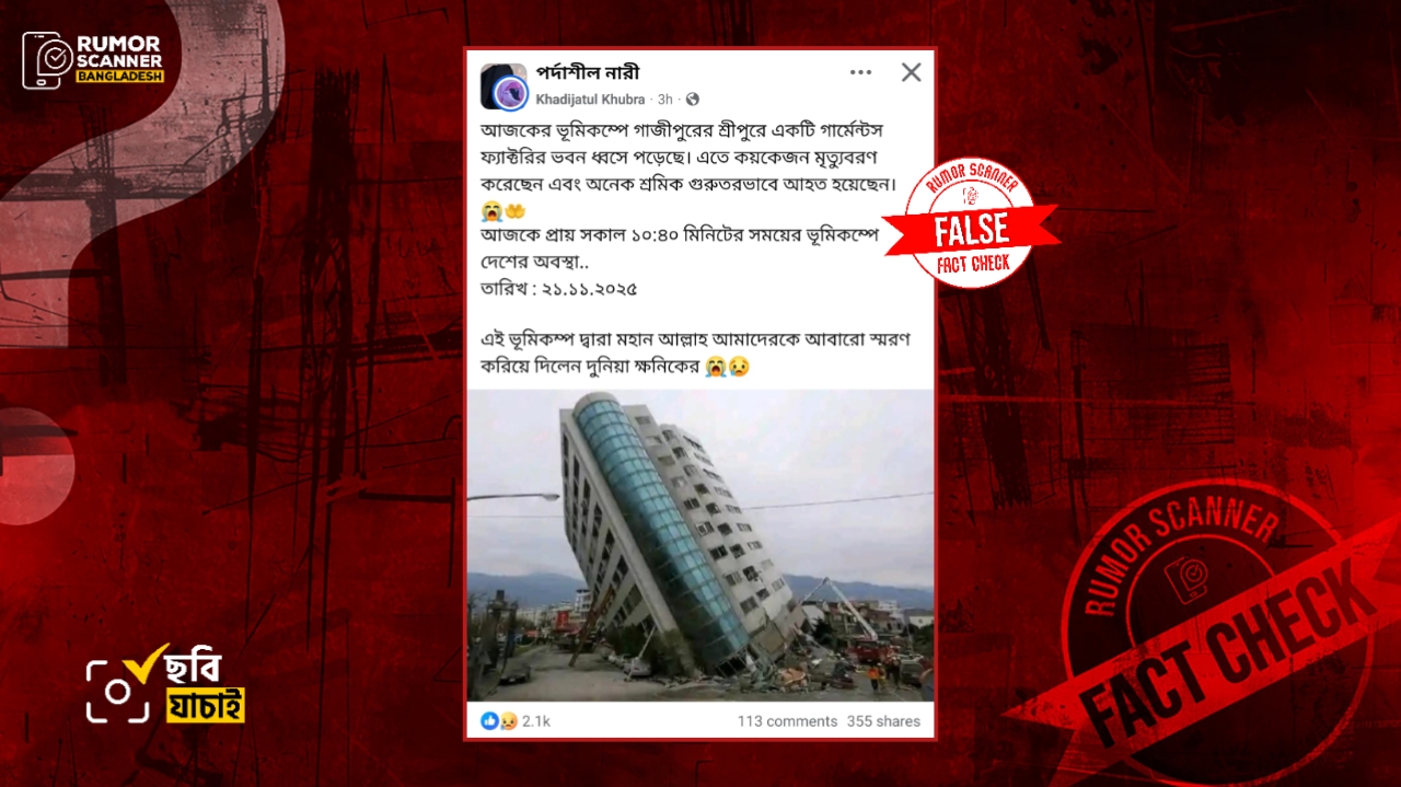 সুতরাং, ২০১৮ সালে তাইওয়ানে ঘটে যাওয়া ভূমিকম্পে হেলে পড়া ভবনের ছবিকে গত ২১ নভেম্বরের ভূমিকম্পে গাজীপুরে গার্মেন্টস ফ্যাক্টরি ভবন হেলে পড়েছে দাবিতে প্রচার করা হয়েছে; যা সম্পূর্ণ মিথ্যা।