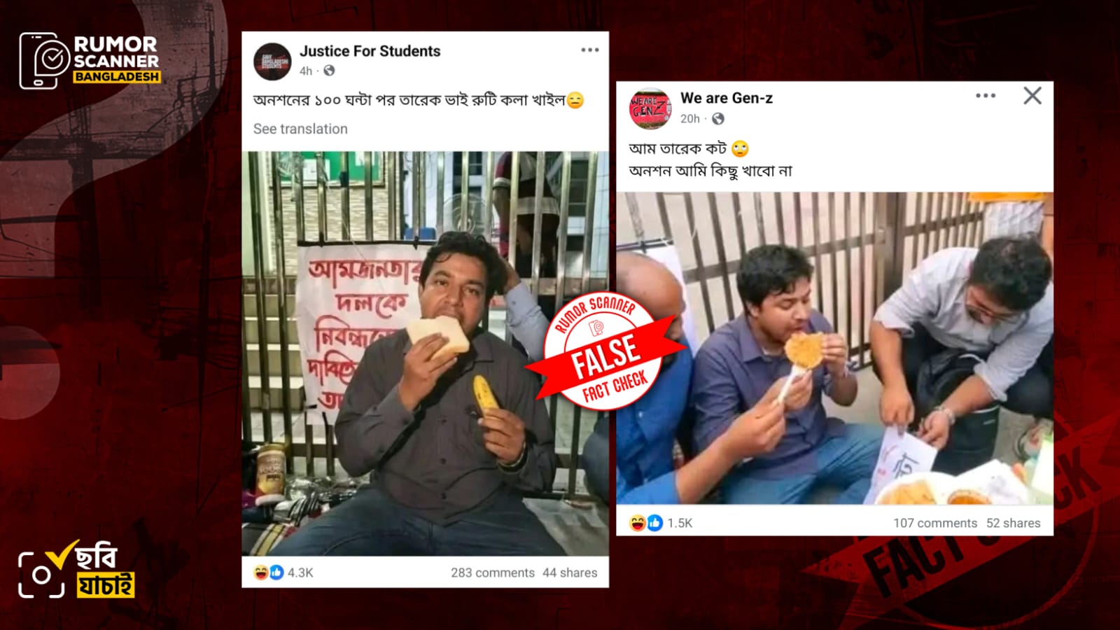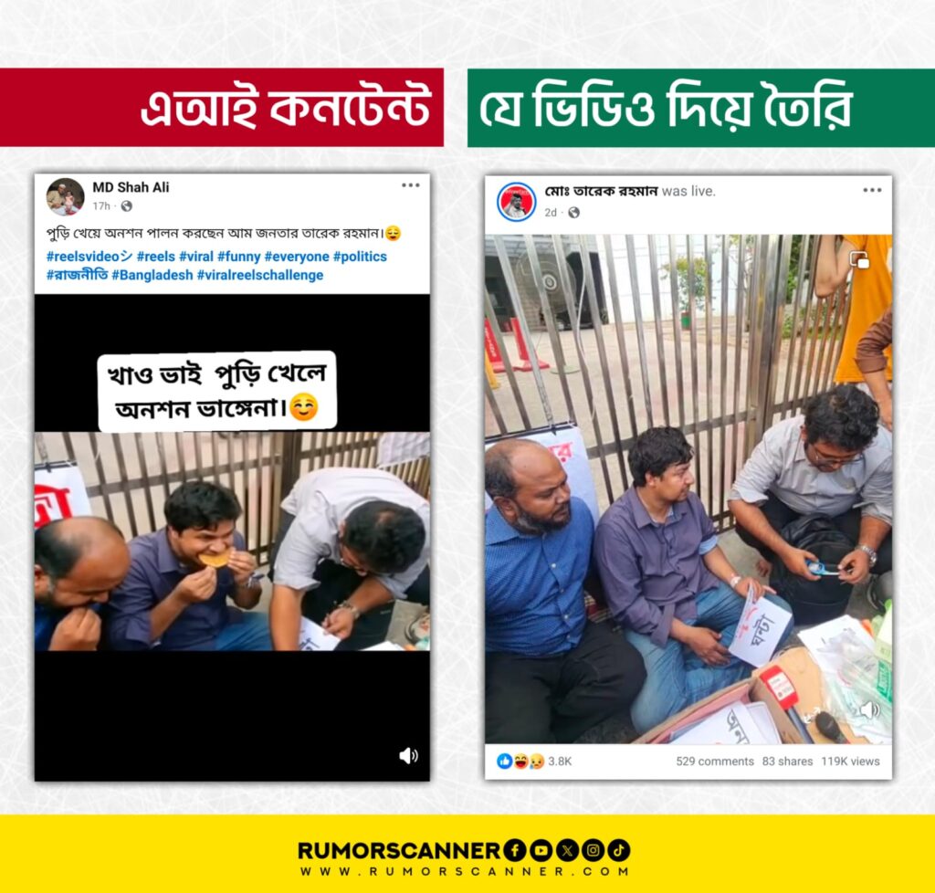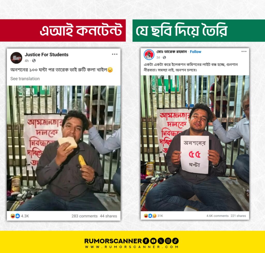 রিউমর স্ক্যানার টিমের অনুসন্ধানে জানা যায়, অনশনকালে তারেক রহমানের কলা-রুটি ও পুরি খাওয়ার দাবিতে প্রচারিত ছবি ও ভিডিওগুলো আসল নয়। প্রকৃতপক্ষে, কৃত্রিম বুদ্ধিমত্তা (এআই) প্রযুক্তি ব্যবহার করে এগুলো তৈরি করে প্রচার করা হয়েছে।