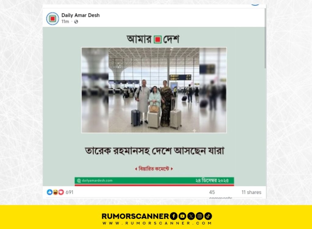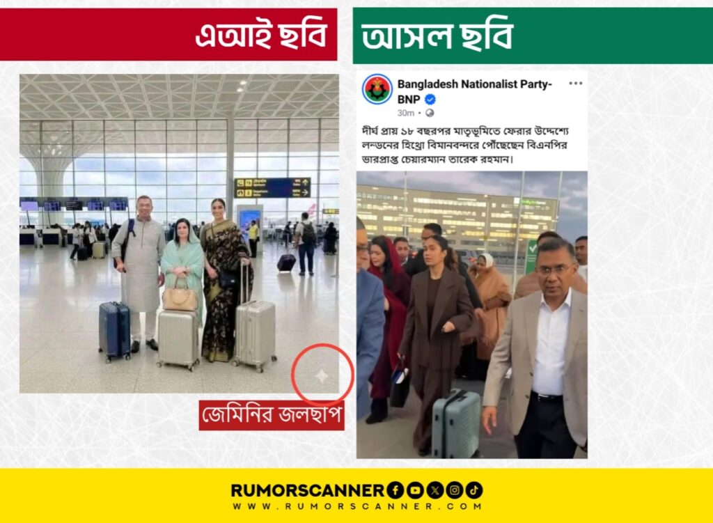 এ বিষয়ে অনুসন্ধানে বিএনপির ফেসবুক পেজে ২৪ ডিসেম্বর রাতে প্রকাশিত একটি পোস্টে তারেক রহমান, জোবায়দা রহমান ও জাইমা রহমানের একটি ছবি পাওয়া যায়। পোস্টের ক্যাপশন থেকে জানা যায়, দীর্ঘ প্রায় ১৮ বছর পর মাতৃভূমিতে ফেরার উদ্দেশ্যে লন্ডনের হিথ্রো বিমানবন্দরে বিএনপির ভারপ্রাপ্ত চেয়ারম্যান তারেক রহমানের পৌঁছানোর দৃশ্য এটি। এই ছবিতে তারেক, জোবায়দা ও জাইমার পোশাকের সাথে আলোচিত ছবির পোশাকের মিল পাওয়া যায়নি। তাছাড়া, প্রচারিত ছবিটির এক কোণে গুগলের জেমিনি এআইয়ের জলছাপ লক্ষ্য করা যায়।