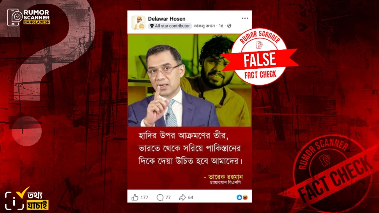 সুতরাং, বিএনপির ভারপ্রাপ্ত চেয়ারম্যান তারেক রহমান ‘হাদির উপর আক্রমণের তীর, ভারতে থেকে সরিয়ে পাকিস্তানের দিকে দেয়া উচিত হবে আমাদের’ বলে মন্তব্য করেছেন শীর্ষক দাবিটি মিথ্যা।