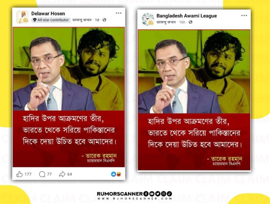 ঢাকা-৮ আসনের সম্ভাব্য স্বতন্ত্র প্রার্থী ও ইনকিলাব মঞ্চের মুখপাত্র শরিফ ওসমান হাদি গত ১২ ডিসেম্বর রাজধানীর বিজয়নগরের বক্স কালভার্ট এলাকায় গুলিবিদ্ধ হয়েছেন। পরবর্তীতে গত ১৮ ডিসেম্বর সিঙ্গাপুরে চিকিৎসাধীন অবস্থায় মারা যান তিনি। অনলাইনে এজন্য অনেক নেটিজেনরা আওয়ামী লীগ ও ভারতকে দায়ী করছেন। এরই প্রেক্ষিতে সম্প্রতি সামাজিক যোগাযোগ মাধ্যমে বিএনপির ভারপ্রাপ্ত চেয়ারম্যান তারেক রহমান ও ওসমান হাদির ছবিযুক্ত একটি ফটোকার্ড প্রচার করা হয়। যেখানে দাবি করা হয় যে তারেক রহমান বলেছেন- ‘হাদির উপর আক্রমণের তীর, ভারতে থেকে সরিয়ে পাকিস্তানের দিকে দেয়া উচিত হবে আমাদের’।