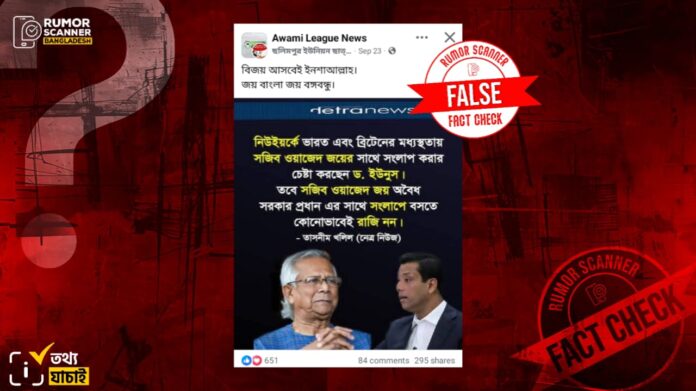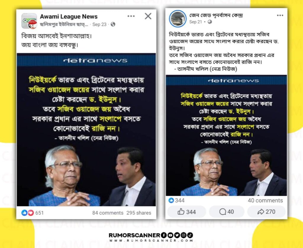 জাতিসংঘ সাধারণ পরিষদের (ইউএনজিএ) ৮০তম অধিবেশনে যোগ দিতে যুক্তরাষ্ট্রের উদ্দেশ্যে গত ২২ সেপ্টেম্বর দেশ ছাড়েন প্রধান উপদেষ্টা ড. মুহাম্মদ ইউনূস। অধিবেশনে গত ২৬ সেপ্টেম্বরে ভাষণ দেন তিনি। এরই প্রেক্ষিতে নেত্র নিউজের প্রধান সম্পাদক তাসনিম খলিলের মন্তব্য দাবিতে সামাজিক যোগাযোগ মাধ্যমে দাবি প্রচার করা হয়, ‘নিউইয়র্কে ভারত এবং ব্রিটেনের মধ্যস্থতায় সজিব ওয়াজেদ জয়ের সাথে সংলাপ করার চেষ্টা করছেন ড. ইউনুস। তবে সজিব ওয়াজেদ জয় অবৈধ সরকার প্রধান এর সাথে সংলাপে বসতে কোনোভাবেই রাজি নন। – তাসনীম খলিল (নেত্র নিউজ)’