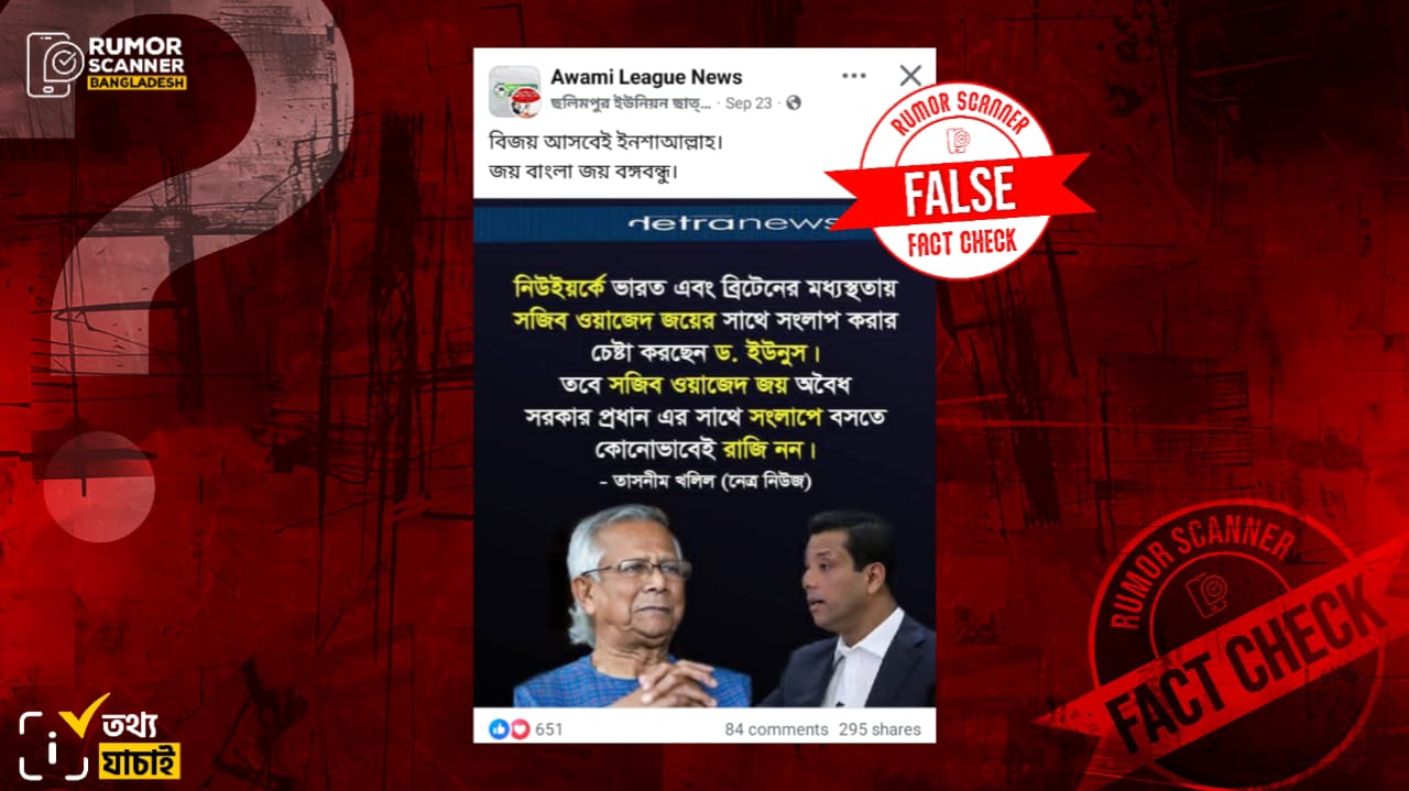 রিউমর স্ক্যানার টিমের অনুসন্ধানে জানা যায়, সজীব ওয়াজেদের সাথে ড. ইউনূসের সংলাপের বিষয়ে কোনো প্রকাশ্য মন্তব্য সাংবাদিক তাসনিম খলিল করেননি এবং নেত্র নিউজও এমন কোনো সংবাদ প্রকাশ করেনি। প্রকৃতপক্ষে, কোনো নির্ভরযোগ্য তথ্যপ্রমাণ ছাড়াই আলোচিত ভুয়া দাবিটি প্রচার করা হয়েছে।