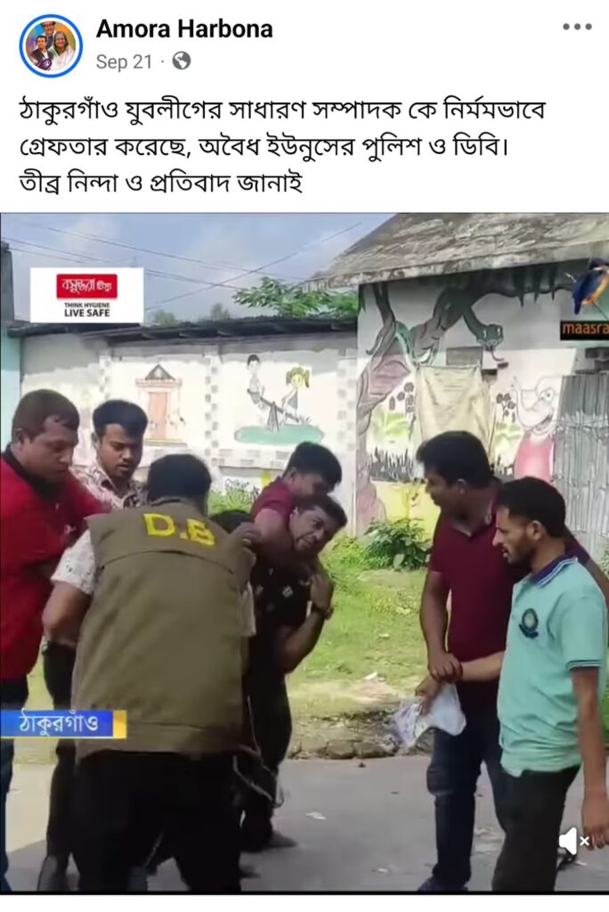 গেল সেপ্টেম্বরে ‘ঠাকুরগাঁও যুবলীগের সাধারণ সম্পাদক কে নির্মমভাবে গ্রেফতার করেছে, অবৈধ ইউনুসের পুলিশ ও ডিবি।’ ক্যাপশনে একটি ভিডিও সামাজিক যোগাযোগ মাধ্যমে প্রচার করা হয়েছে।