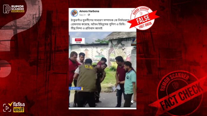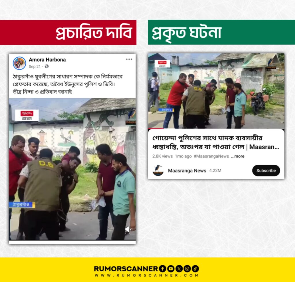 রিউমর স্ক্যানার টিমের অনুসন্ধানে জানা যায়, প্রচারিত ভিডিওটি বাংলাদেশ পুলিশ ও ডিবি কর্তৃক বাংলাদেশ আওয়ামী যুবলীগের ঠাকুরগাঁও জেলার সাধারণ সম্পাদককে গ্রেফতারের ঘটনার দৃশ্য নয়। এছাড়া, ঠাকুরগাঁও জেলা যুবলীগের সাধারণ সম্পাদককে ২০২৪ সালের অক্টোবর মাসেই গ্রেফতার করা হয়েছে। প্রকৃতপক্ষে, ঠাকুরগাঁও শহরে ডিবি পুলিশ কর্তৃক দুই মাদক ব্যবসায়ীকে আটকের ভিডিওকে উক্ত দাবিতে প্রচার করা হয়েছে।