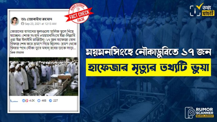 সম্প্রতি “ময়মনসিংহে ১৭জন হাফেজা বোন কোরআন হেফজ শেষ করে ভ্রমণে গিয়েছিল। ভ্রমণ শেষে বাড়ি ফিরার সময় নৌকা ডুবে ইন্তেকাল করেন।” শীর্ষক শিরোনামে একটি তথ্য সামাজিক যোগাযোগ মাধ্যম ফেসবুকে ছড়িয়ে পড়েছে।