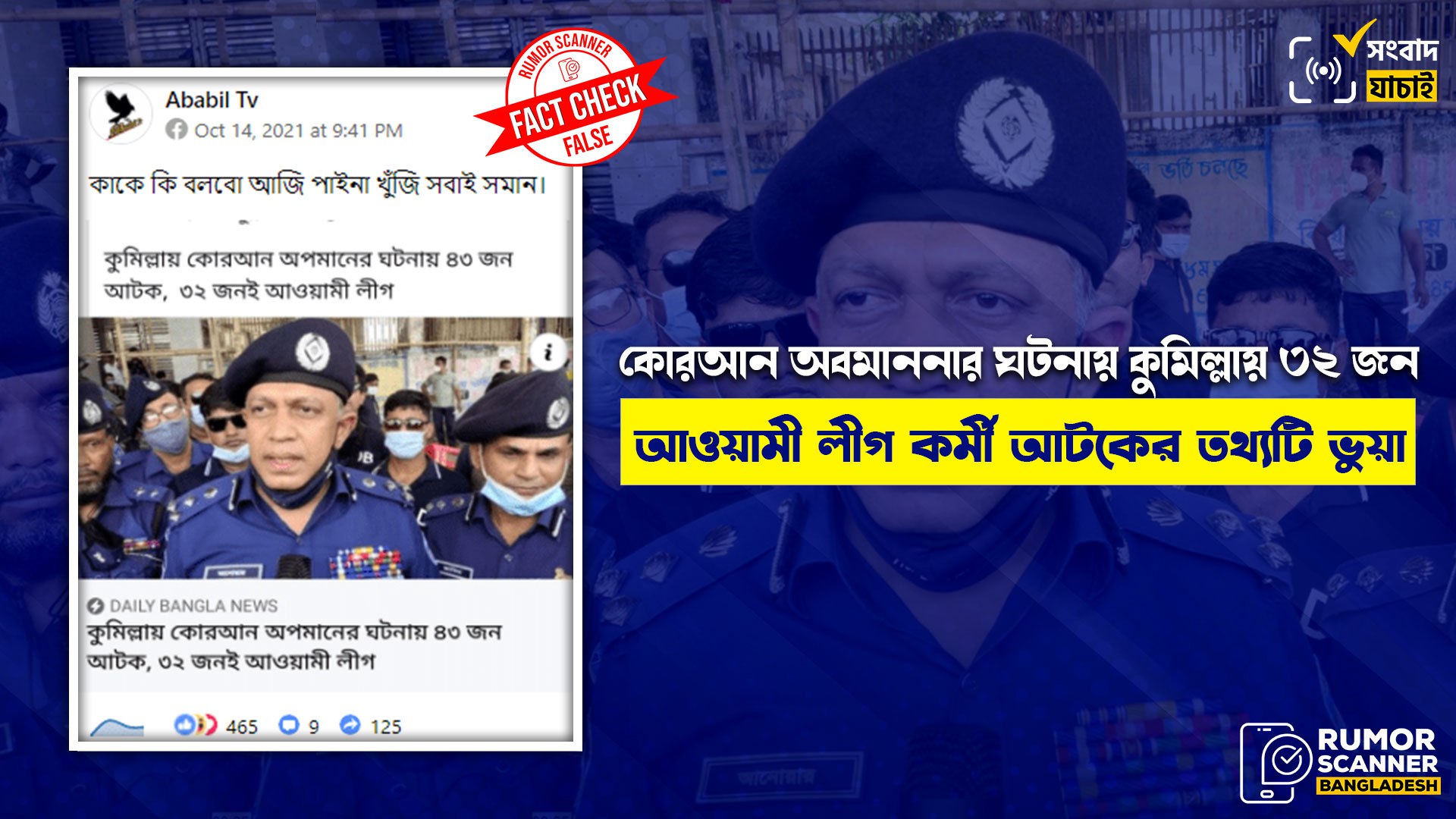 অর্থাৎ, কুমিল্লায় কোরআন অবমাননার জেরে বিক্ষোভ ও সংঘর্ষের ঘটনায় আটক ৪৩ জনের মধ্যে ৩২ জনই আওয়ামী লীগ কর্মী দাবিতে প্রচারিত তথ্যটি সম্পূর্ণ বানোয়াট ও গুজব।