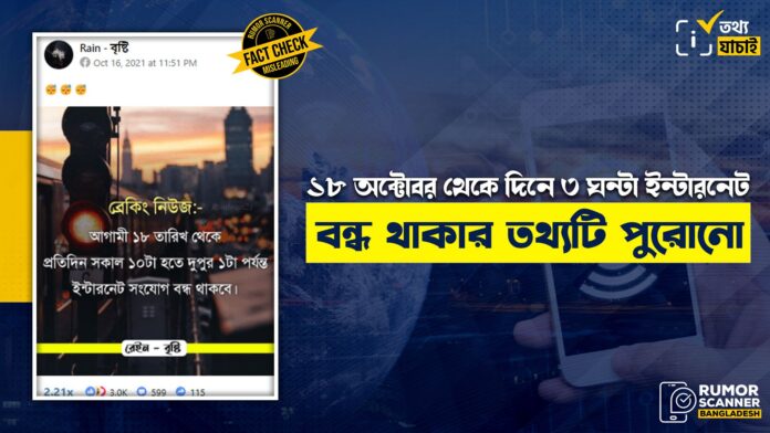 রিউমার স্ক্যানার টিমের অনুসন্ধানে দেখা যায়, ১৮ অক্টোবর হতে প্রতিদিন তিন ঘণ্টা ইন্টারনেট বন্ধ রাখার সিদ্ধান্তের বিষয়টি চলতি বছরের নয় বরং বিষয়টি গত বছরের।