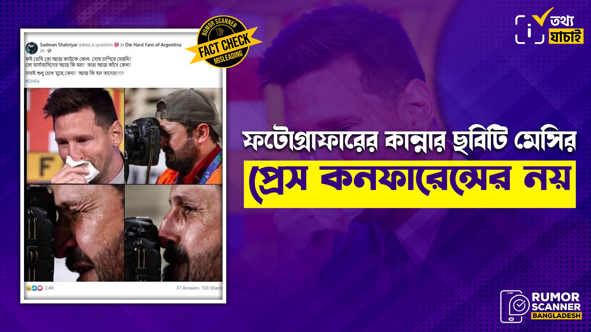 রিউমর স্ক্যানার টিমের অনুসন্ধানে দেখা যায়, ফটোগ্রাফারের কান্নার ছবিটি মেসির আজকের প্রেস কনফারেন্সের নয় বরং ছবিটি ২০১৯ সালে ধারণ করা একজন ইরাকি ফটোগ্রাফারের।