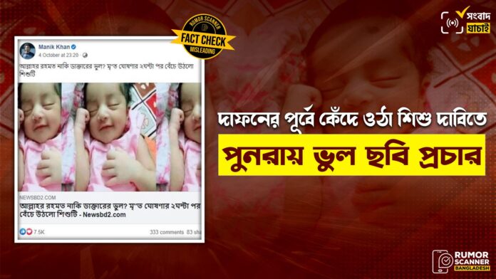 “আল্লাহর রহমত নাকি ডাক্তারের ভুল? মৃ”ত ঘোষণার ২ঘন্টা পর বেঁচে উঠলো শিশুটি” শীর্ষক শিরোনামে একটি তথ্য ও ছবি সামাজিক মাধ্যমে ছড়িয়ে পড়েছে।