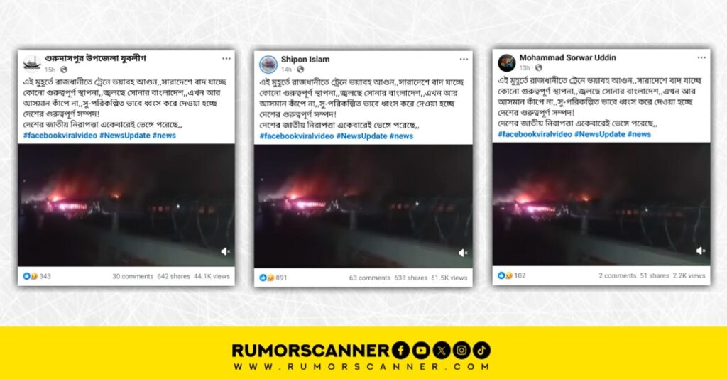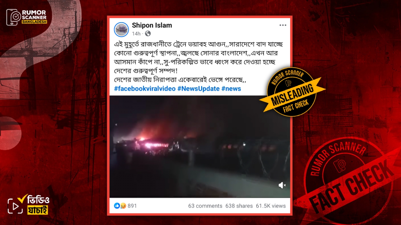 গত কয়েকদিনে দেশের বিভিন্ন জায়গায় পর পর কয়েকটি ভয়াবহ অগ্নিকাণ্ডের ঘটনা ঘটেছে। যাতে গুরুত্বপূর্ণ স্থাপনা থেকে শুরু করে ক্ষতিগ্রস্ত হয় শত শত কোটি টাকার সম্পদ। যার মধ্যে মিরপুর রুপনগর কেমিক্যাল গোডাউন ও পোশাক কারখানায় লাগা আগুনের ঘটনায় প্রাণ হারায় ১৬ জন। এরই প্রেক্ষিতে গত ১৯ অক্টোবর রাতে রাজধানী ঢাকায় একটি ট্রেনে আগুন লাগার ঘটনা ঘটে দাবিতে সামাজিক যোগাযোগ মাধ্যমে একটি ভিডিও প্রচার করা হয়েছে।