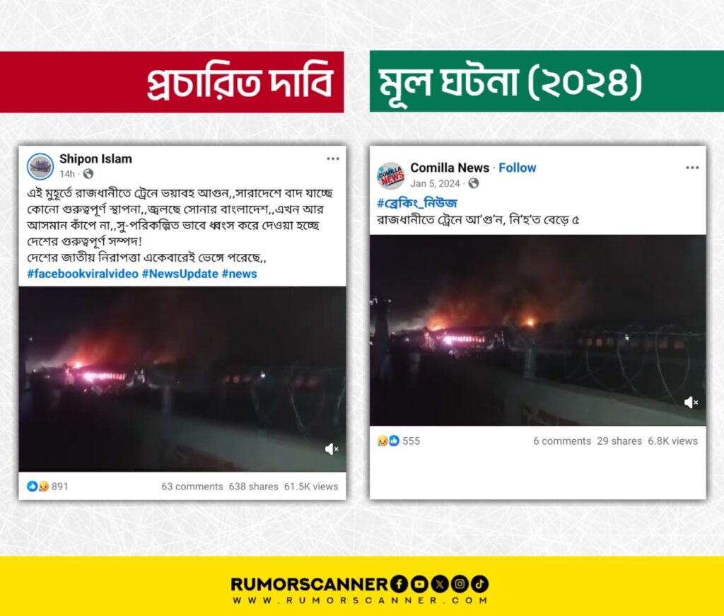 সুতরাং, ২০২৪ সালে বেনাপোল এক্সপ্রেস ট্রেনে আগুন দেওয়ার ঘটনাকে সম্প্রতি রাজধানীতে ট্রেনে আগুন লাগার ভিডিও দাবিতে প্রচার করা হচ্ছে; যা বিভ্রান্তিকর।