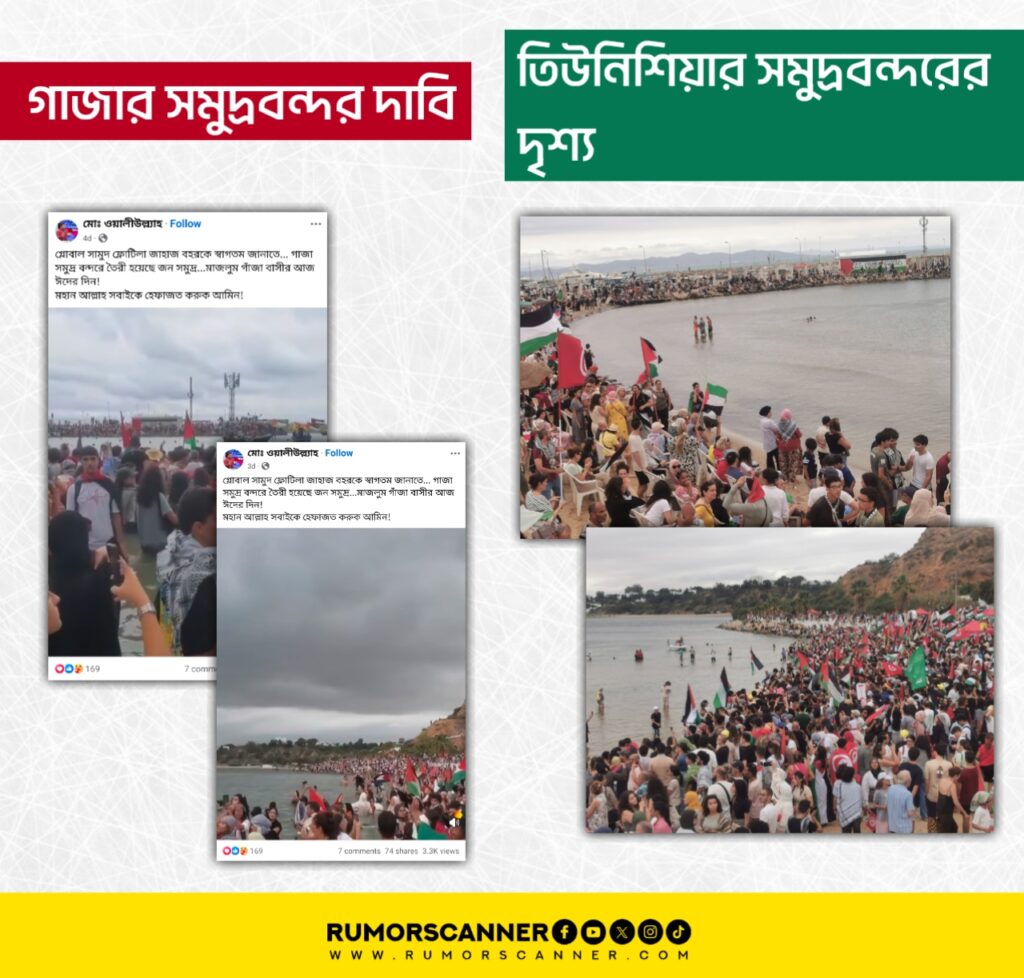 পোস্টটির ছবিগুলো পর্যালোচনা করে দেখা যায়, গাজার সমুদ্র তীরে গ্লোবাল সুমুদ ফ্লোটিলা নৌবহরকে স্বাগত জানানোর ভিডিও দাবিতে প্রচারিত ভিডিওর জনসমাগমের সাথে উক্ত পোস্টের ছবির স্থান ও জনসমাগমের মিল পাওয়া যায়। উভয় স্থানেই উপস্থিত জনগনের হাতে ফিলিস্তিনের ও তিউনিসিয়ার পতাকা দেখতে পাওয়া যায়। এছাড়াও পোস্টটির শিরোনাম থেকে জানা যায়, ছবিগুলো তিউনিসিয়ার বিভিন্ন অঞ্চল থেকে গ্লোবাল সুমুদ ফ্লোটিলা নৌবহরকে বিদায় জানাতে তিউনিসিয়ার সিদি বু সাইদ বন্দরে আসা জনসমাগমের।