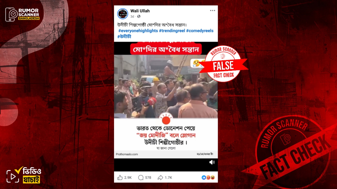 রিউমর স্ক্যানার টিমের অনুসন্ধানে জানা যায়, উদীচী শিল্পীগোষ্ঠীর জয় মোদিজী বলে স্লোগান দেওয়ার বিষয়টি সত্য নয়। প্রকৃতপক্ষে, ভিডিওতে তারা বলছিলেন ‘জয় উদীচী’। উক্ত ভিডিওকে একটি পেজ থেকে সার্কাজম হিসেবে ‘জয় মোদিজী’ বলে পোস্ট করা হয় সেখান থেকেই দাবিটির সূত্রপাত ঘটে।