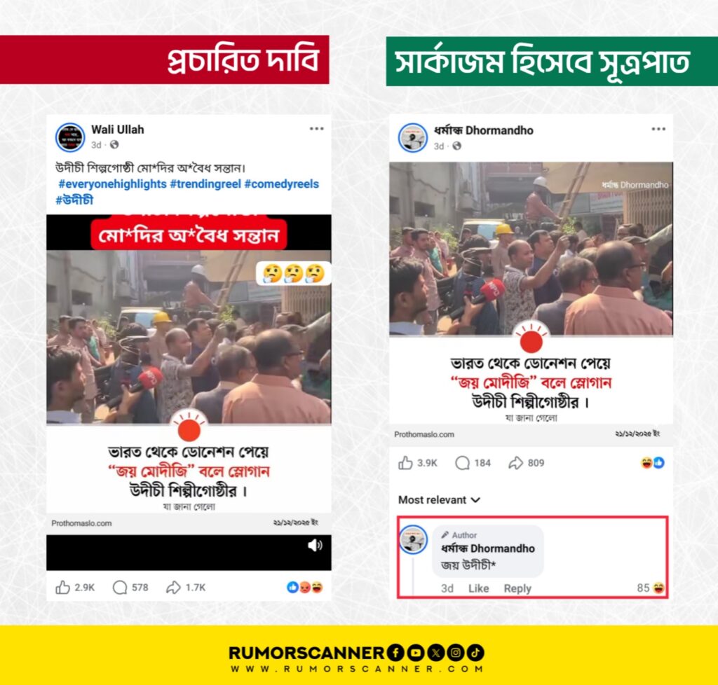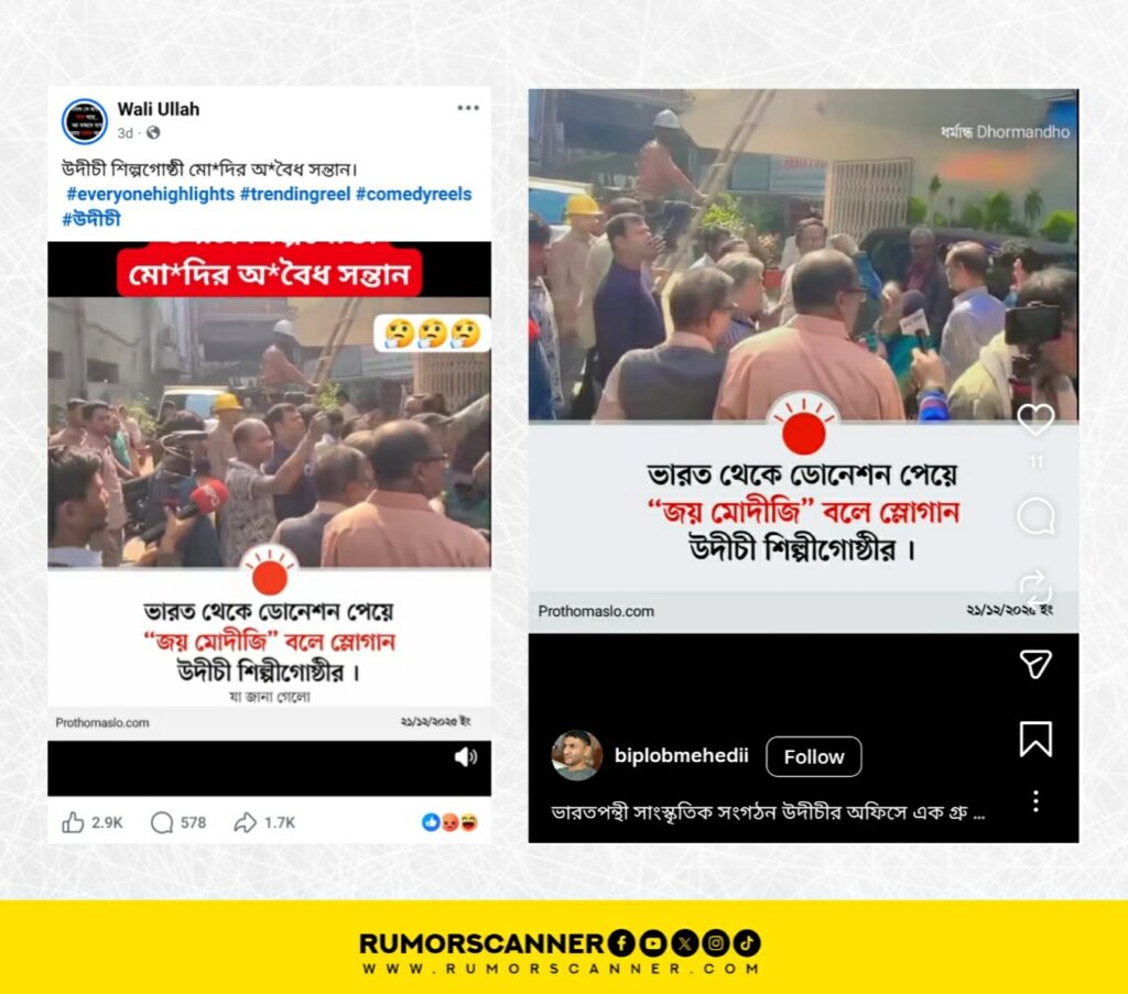 এ বিষয়ে অনুসন্ধানে ধর্মান্ধ Dhormandho নামের একটি ফেসবুক পেজ থেকে ২২ ডিসেম্বর প্রকাশিত একটি ফটোকার্ড পাওয়া যায়। উক্ত ফটোকার্ডের সাথে প্রচারিত ফটোকার্ডের সাদৃশ্য রয়েছে। ফটোকার্ডে লেখা রয়েছে, “ভারত থেকে ডোনেশন পেয়ে জয় মোদীজি বলে স্লোগান উদীচী শিল্পীগোষ্ঠীর” তবে উক্ত পোস্টের মন্তব্য অংশে একই পেজ থেকেই স্পষ্ট করে উল্লেখ করা হয় যে স্লোগানে ‘মোদিজী’ নয়, বরং ‘উদীচী’ বলা হয়েছে। পরবর্তী সময়ে উক্ত পোস্টকেই সত্য ভেবে সামাজিক যোগাযোগমাধ্যমে প্রচার করা হয়। ‘ধর্মান্ধ’ নামের ফেসবুক পেজটি পর্যবেক্ষণ করে দেখা যায়, পেজটি অধিকাংশ সময়ই বিভিন্ন ব্যঙ্গাত্মক পোস্ট প্রকাশ করে থাকে (১, ২)।