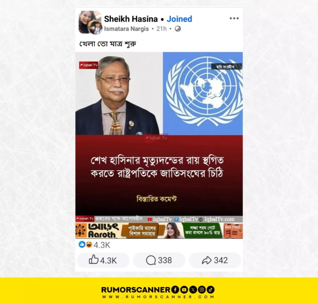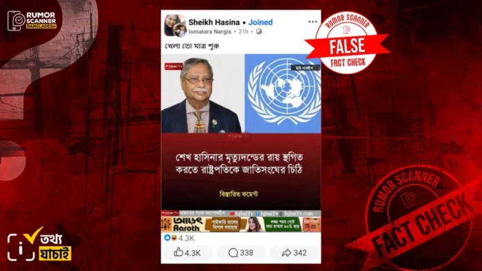 মানবতাবিরোধী অপরাধের মামলায় দোষী সাব্যস্ত করে ক্ষমতাচ্যুত প্রধানমন্ত্রী শেখ হাসিনা ও সাবেক স্বরাষ্ট্রমন্ত্রী আসাদুজ্জামান খান কামালকে মৃত্যুদণ্ড দিয়েছেন আন্তর্জাতিক অপরাধ ট্রাইব্যুনাল। আন্তর্জাতিক অপরাধ ট্রাইব্যুনাল-১–এর চেয়ারম্যান বিচারপতি গোলাম মর্তূজা মজুমদারের নেতৃত্বাধীন তিন সদস্যের ট্রাইব্যুনাল ১৭ নভেম্বর এ রায় দেন। এর প্রেক্ষিতেই ‘শেখ হাসিনার মৃত্যুদন্ডের রায় স্থগিত করতে রাষ্ট্রপতিকে জাতিসংঘের চিঠি’ শীর্ষক একটি দাবি সামাজিক যোগাযোগ মাধ্যমে প্রচার করা হচ্ছে।