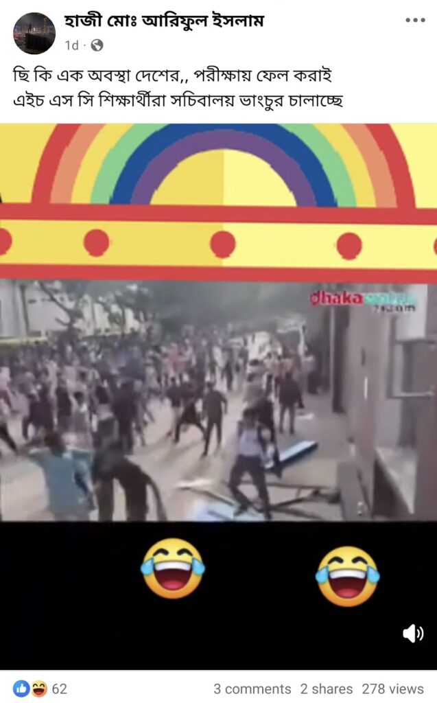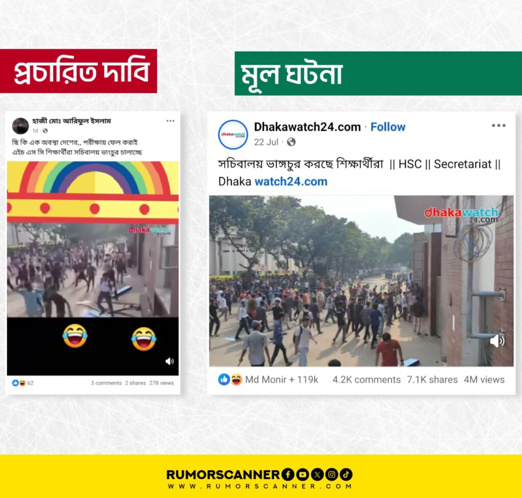 সুতরাং, গত ২২ জুলাই ভিন্ন ঘটনার প্রেক্ষিতে শিক্ষার্থী কর্তৃক সচিবালয় ভাঙচুরের দৃশ্যকে এইচএসসিতে ফেল করা শিক্ষার্থীদের কর্তৃক সচিবালয় ভাঙচুরের দৃশ্য দাবিতে প্রচার করা হচ্ছে; যা বিভ্রান্তিকর।