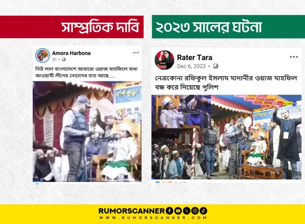 ভিডিওটির ক্যাপশনে বলা হয়, নেত্রকোনা রফিকুল ইসলাম মাদানীর ওয়াজ মাহফিল বন্ধ করে দিয়েছে পুলিশ।