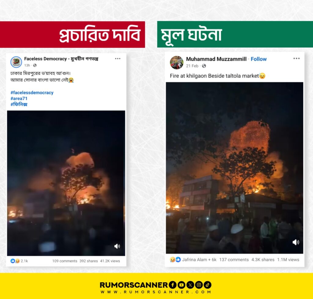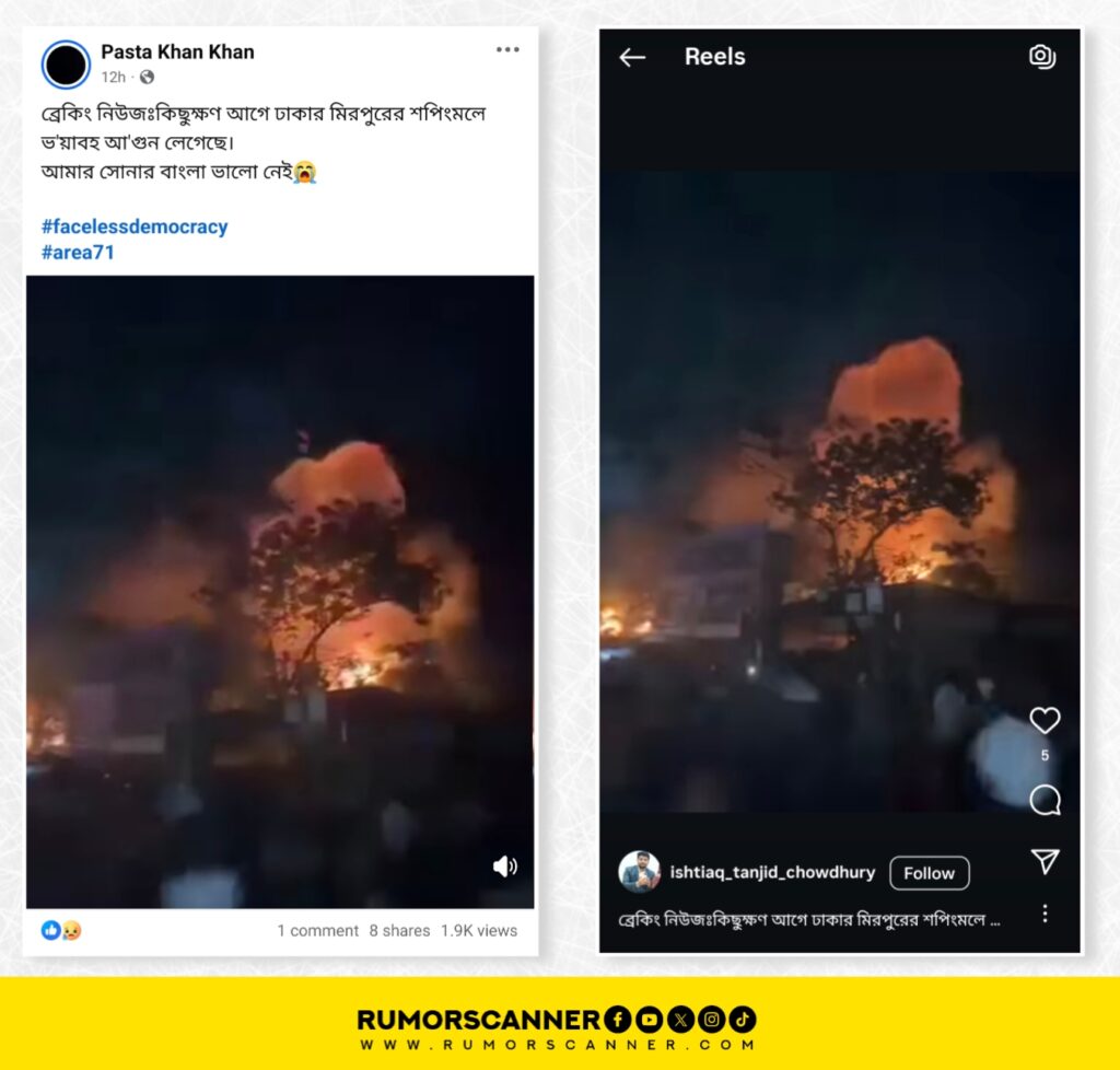 রিউমর স্ক্যানার টিমের অনুসন্ধানে জানা যায়, প্রচারিত ভিডিওটি সাম্প্রতিক সময়ে মিরপুরের কোনো শপিংমলে আগুন লাগার দৃশ্য নয়। এমনকি ভিডিওটি মিরপুরেরই নয়। প্রকৃতপক্ষে, গত ২১ ফেব্রুয়ারি সন্ধ্যায় রাজধানীর খিলগাঁওয়ের তালতলা মার্কেটের পাশের স’ মিলে আগুন লাগে। সেই ঘটনার দৃশ্য এটি।