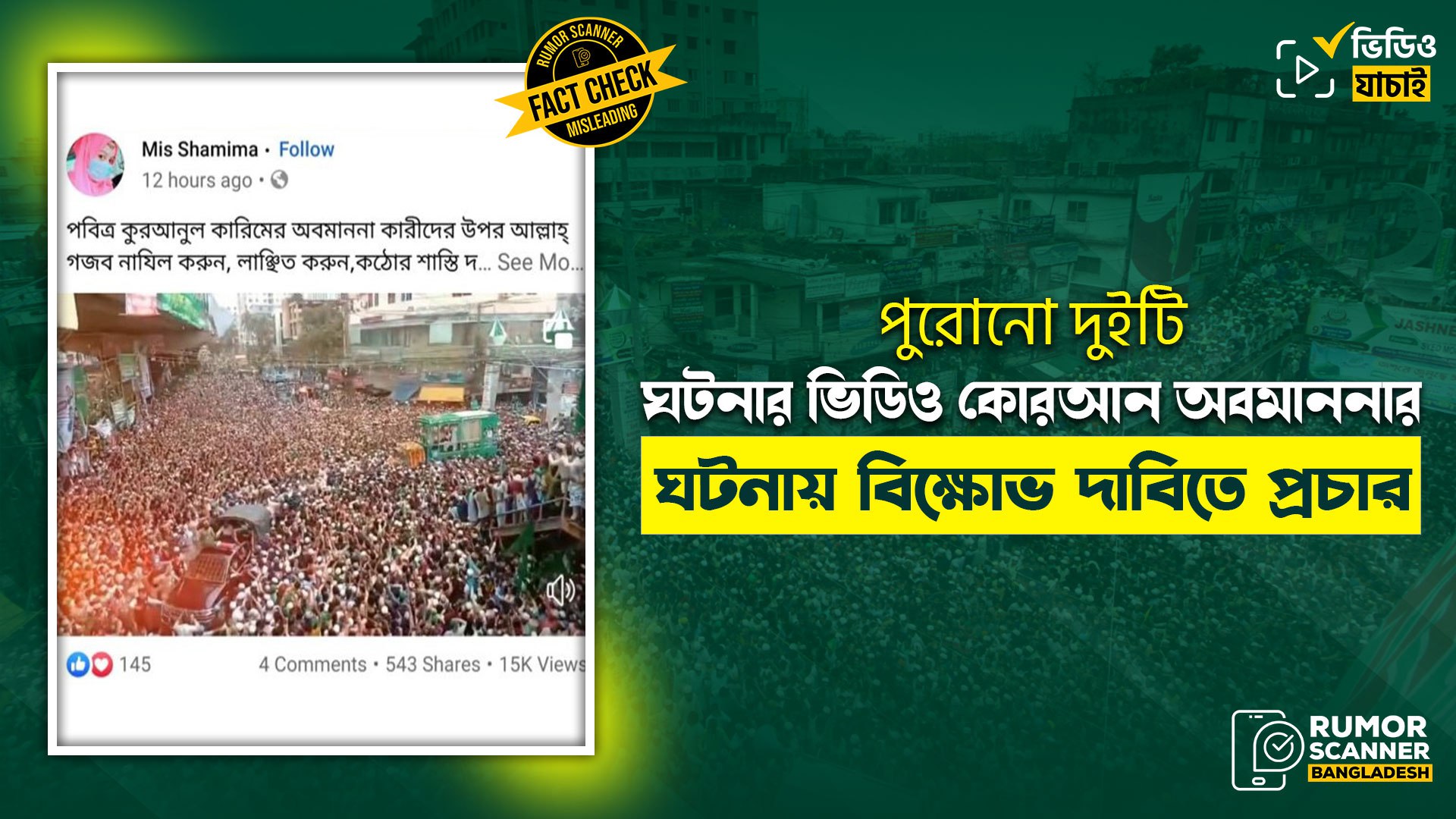 রিউমর স্ক্যানার টিমের অনুসন্ধানে দেখা যায়, প্রচারিত ভিডিও দুইটি কুমিল্লায় কোরআন অবমাননার জন্য বিক্ষোভ মিছিলের নয় বরং প্রথম ভিডিওটি মহানবী ( সা.) এর ব্যঙ্গচিত্র প্রদর্শনের প্রতিবাদে কুমিল্লায় হেফাজতে ইসলামের বিক্ষোভ মিছিলের এবং অপরটি পবিত্র ঈদে মিলাদুন্নবী (সা.) উপলক্ষে চট্টগ্রাম নগরে জশনে জুলুস র্যালির।