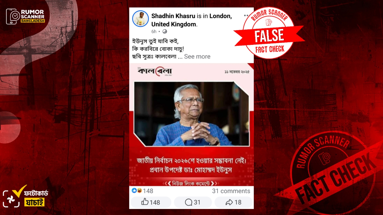 সম্প্রতি, অন্তর্বর্তীকালীন সরকারের প্রধান উপদেষ্টা ড. মুহাম্মদ ইউনূস ‘জাতীয় নির্বাচন ২০২৬শে হওয়ার সম্ভাবনা নেই।’- এমন মন্তব্য করেছেন দাবি করে জাতীয় দৈনিক কালবেলার লোগোসহ একটি ফটোকার্ড সামাজিক যোগাযোগ মাধ্যমে ছড়িয়ে পড়েছে।