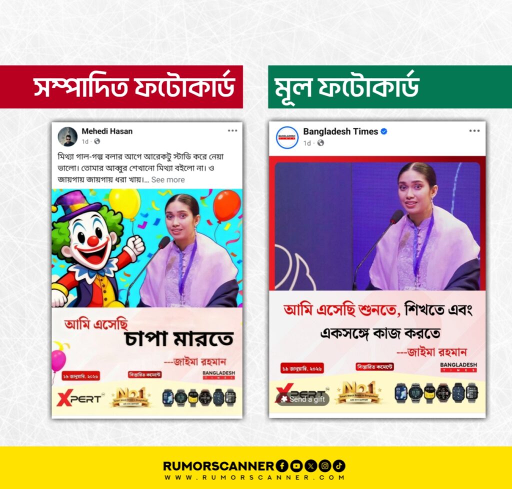 অর্থাৎ, জাইমা রহমানের নামে বাংলাদেশ টাইমস এর লোগো ও ডিজাইন সংবলিত ভুয়া ফটোকার্ড তৈরি করে প্রচার করা হয়েছে।