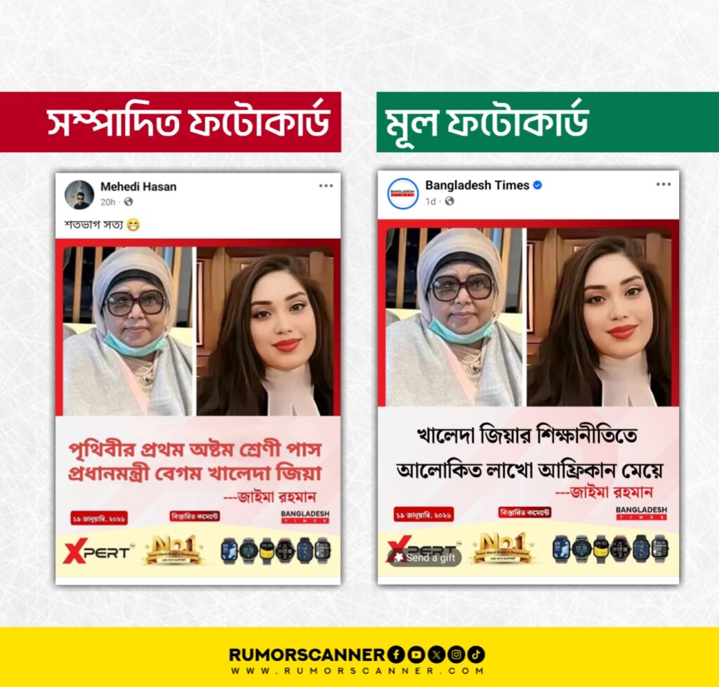 উক্ত ফটোকার্ডটি পর্যবেক্ষণ করে দেখা যায়, এটির সাথে প্রচারিত ফটোকার্ডে বাংলাদেশ টাইমস এর লোগো এবং জাইমা রহমানের ছবির মিল রয়েছে, তবে উভয়ের শিরোনামে ভিন্নতা রয়েছে। মূলত, ‘খালেদা জিয়ার শিক্ষানীতিতে আলোকিত লাখো আফ্রিকান মেয়ে’ শিরোনামে বাংলাদেশ টাইমস এর উক্ত ফটোকার্ডটির মূল শিরোনামের স্থলে ডিজিটাল প্রযুক্তির সহায়তায় ‘পৃথিবীর প্রথম অষ্টম শ্রেণী পাস প্রধানমন্ত্রী বেগম খালেদা জিয়া’ শিরোনামটি প্রতিস্থাপন করে আলোচিত ফটোকার্ডটি তৈরি করা হয়েছে।