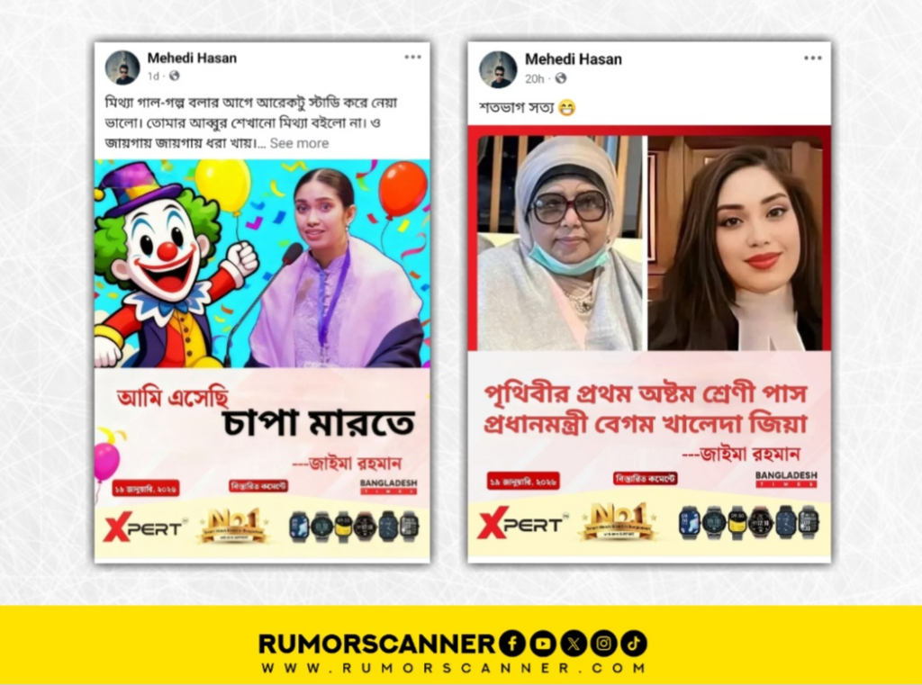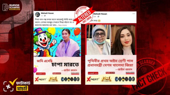 অপর ফটোকার্ডে দাবি করা হয়, ‘পৃথিবীর প্রথম অষ্টম শ্রেণী পাস প্রধানমন্ত্রী বেগম খালেদা জিয়া —জাইমা রহমান’।