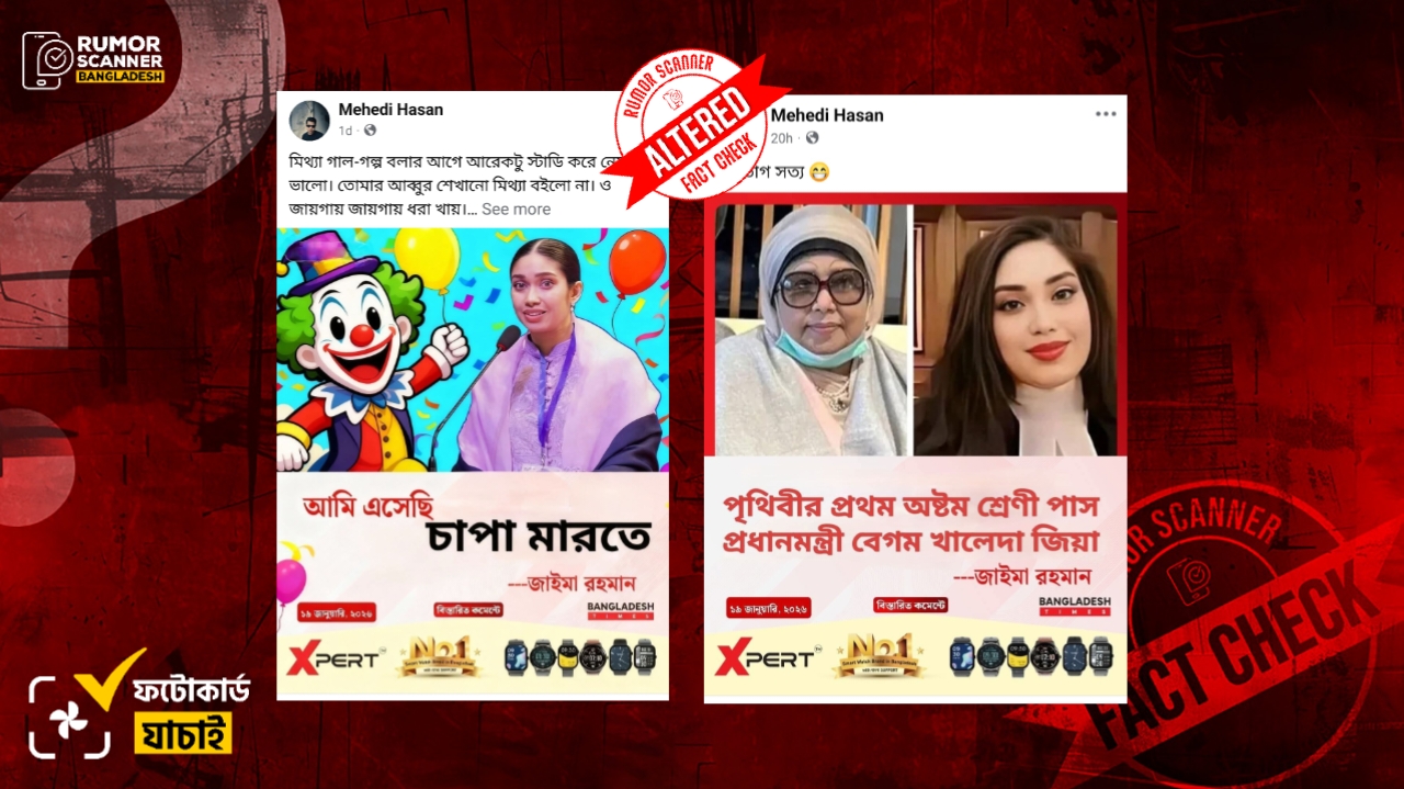 রিউমর স্ক্যানার টিমের অনুসন্ধানে জানা যায়, জাইমা রহমানের মন্তব্য দাবিতে এবং সাবেক প্রধানমন্ত্রী খালেদা জিয়াকে জড়িয়ে জাইমা রহমানের নামে বাংলাদেশ টাইমস উল্লেখিত ফটোকার্ডগুলো বা কোনো সংবাদ প্রচার করেনি এবং জাইমা রহমানও এরূপ কোনো মন্তব্য করেননি৷ প্রকৃতপক্ষে, বাংলাদেশ টাইমস এর ভিন্ন শিরোনামের পৃথক দুটি ফটোকার্ড সম্পাদনা করে আলোচিত ফটোকার্ডগুলো তৈরি করা হয়েছে।