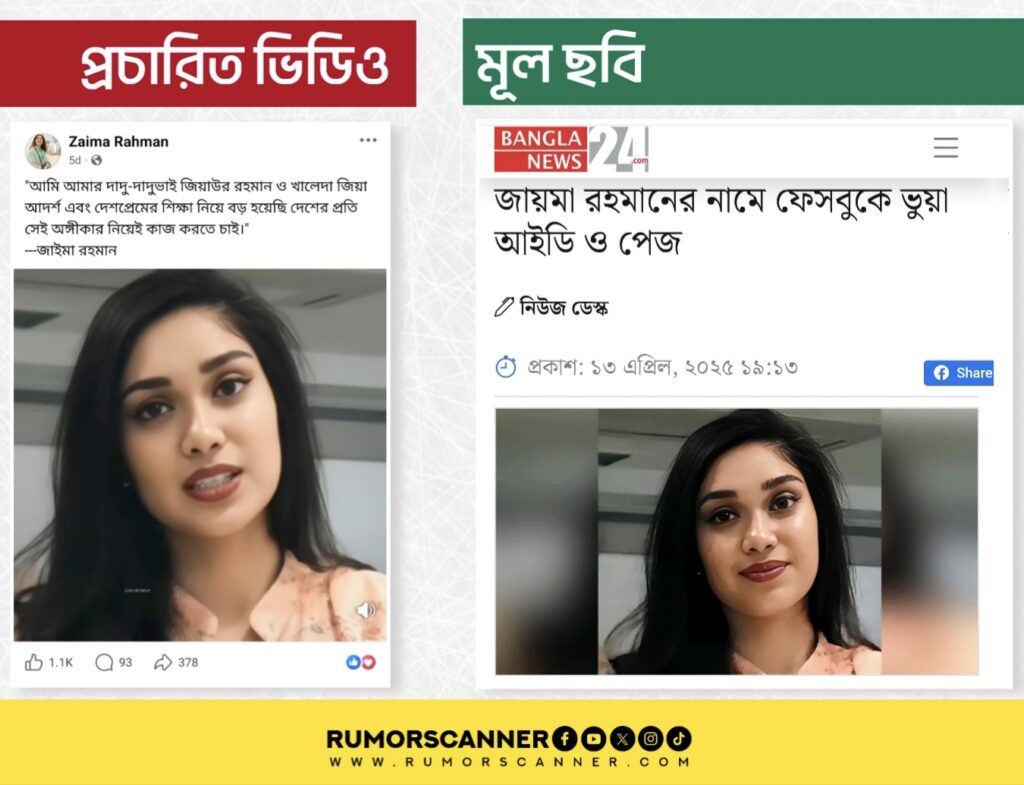 অর্থাৎ, জাইমা রহমানের পুরোনো একটি ছবি ডিপফেক প্রযুক্তির সহযোগিতায় সম্পাদনার মাধ্যমে আলোচিত ভিডিওটি তৈরি করা হয়েছে।